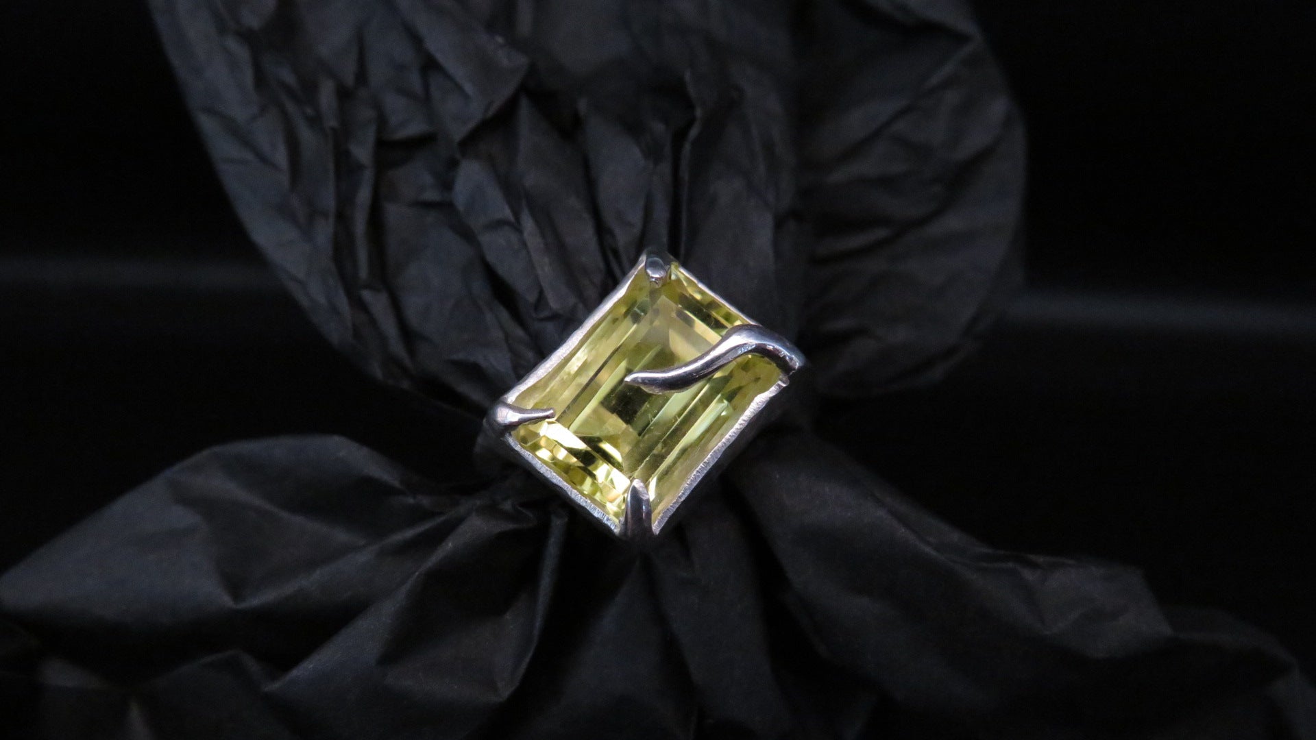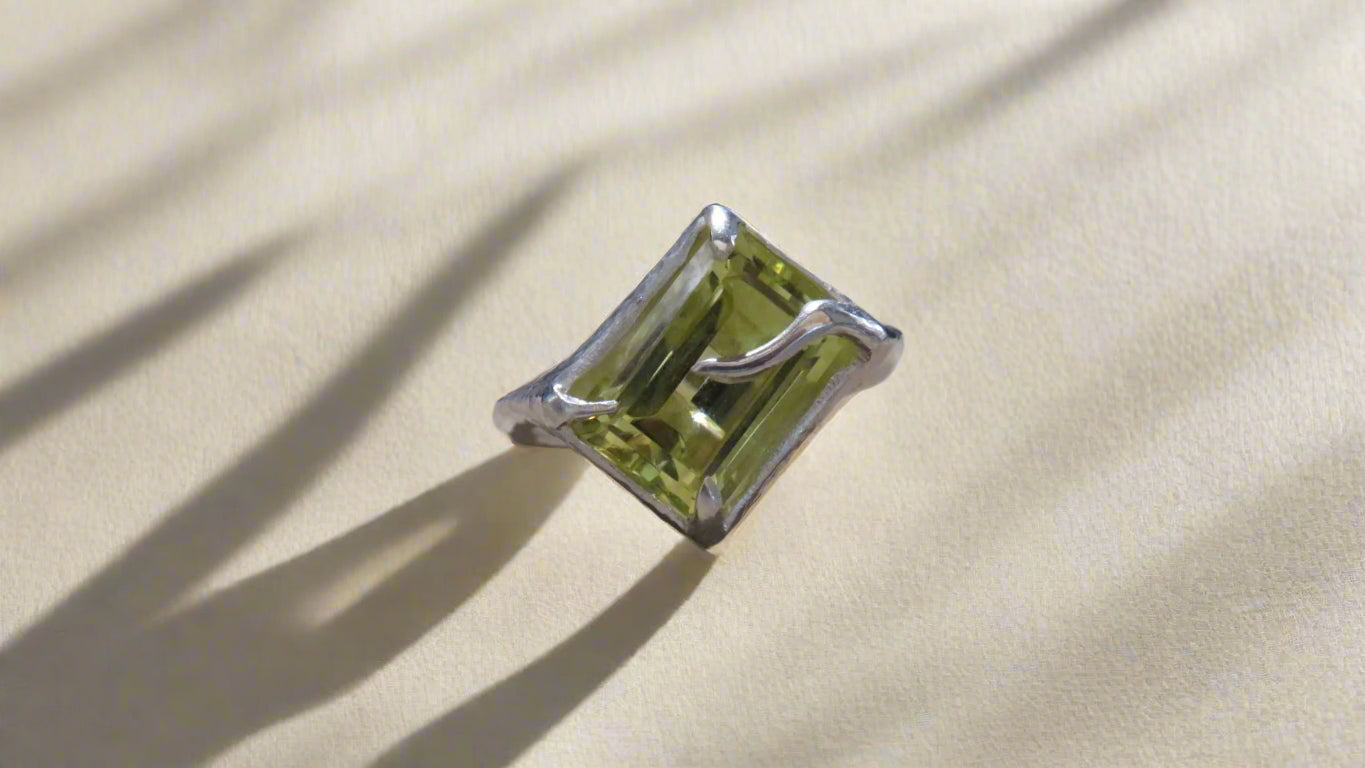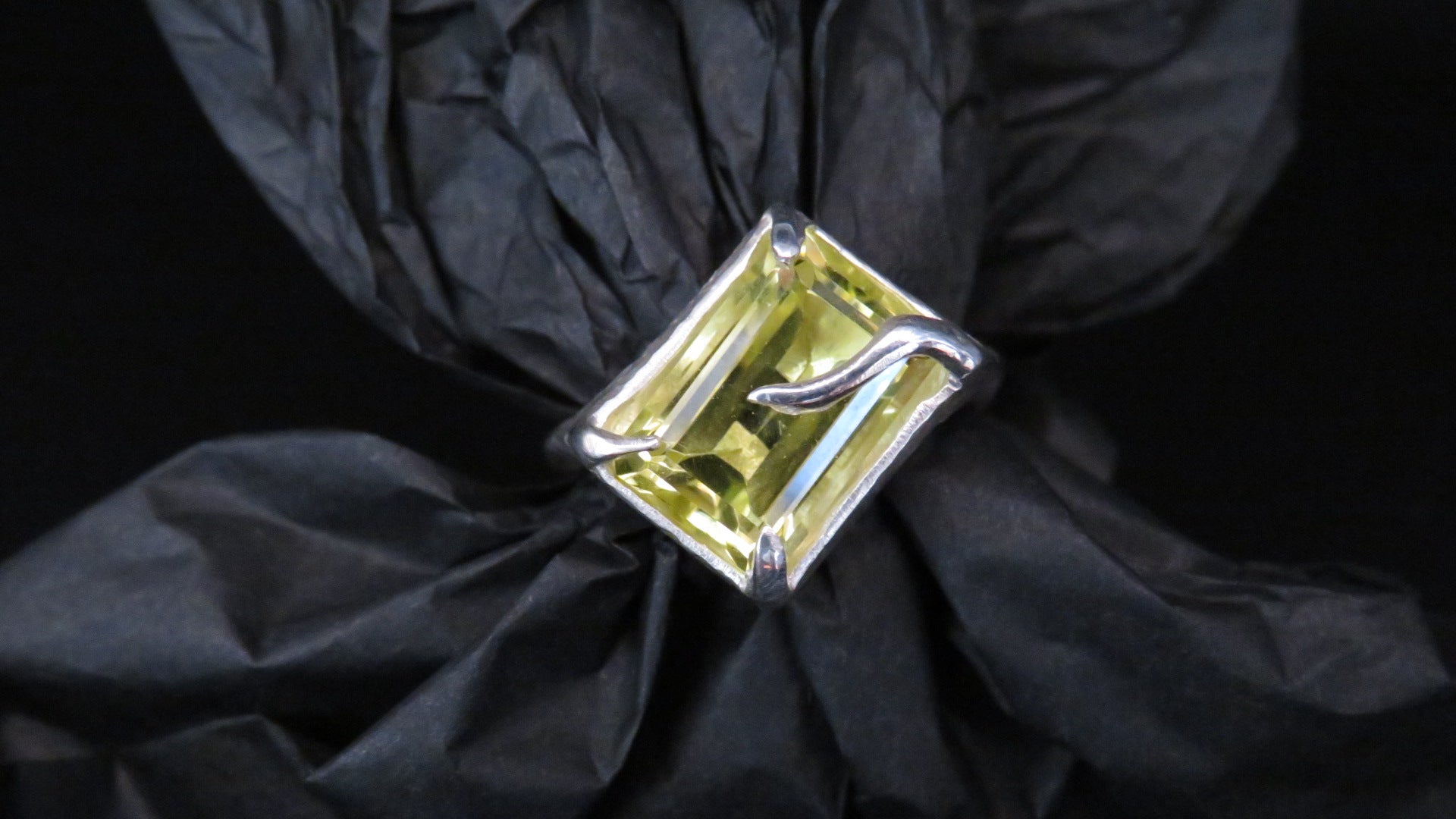 This absolute showstopper holds a refreshing Lemon Quartz. Held in by 4 claws, one being longer than the other.