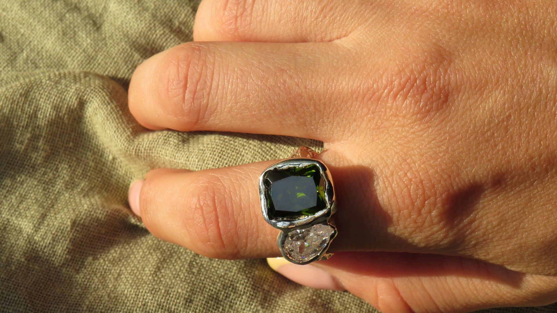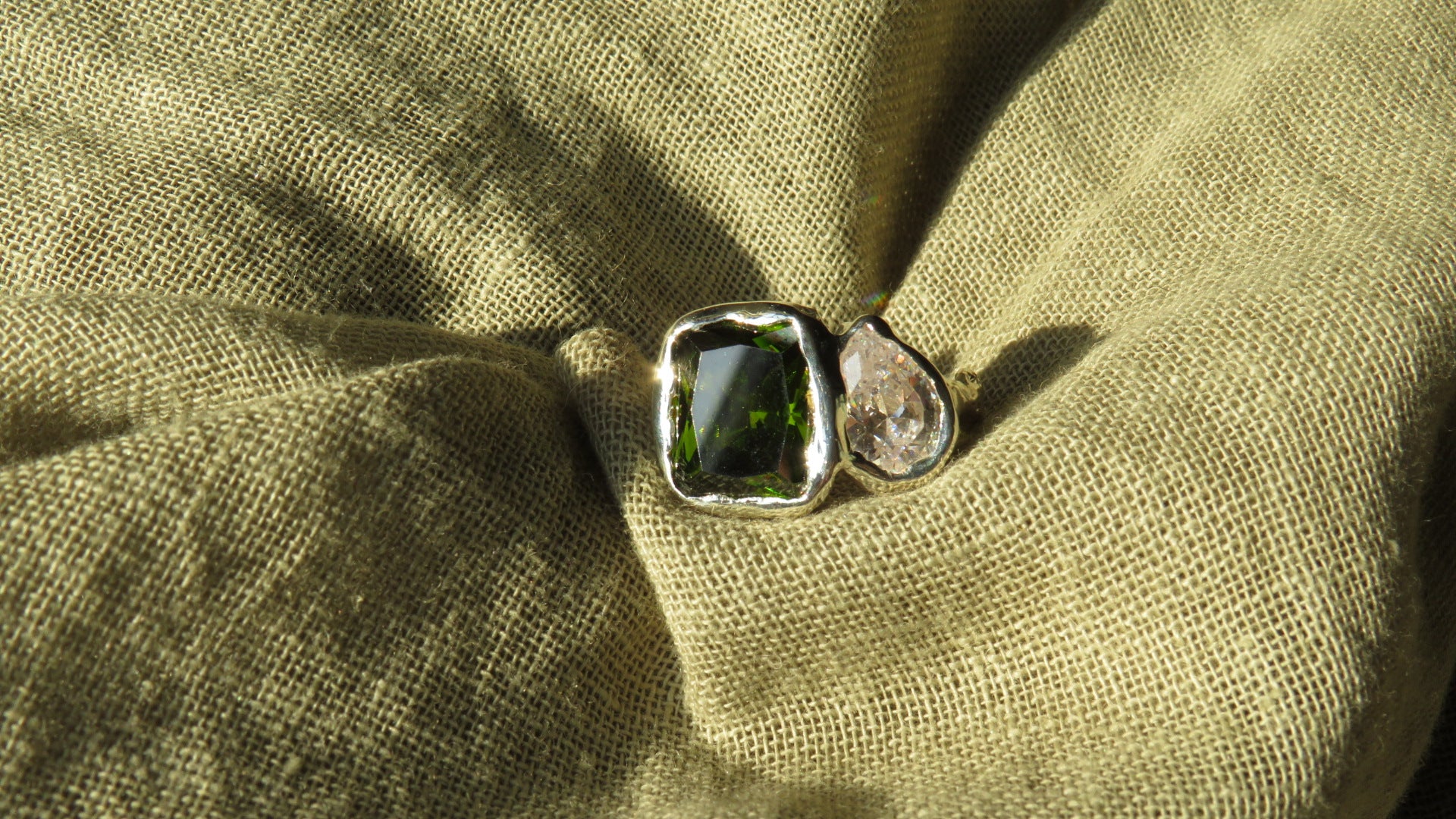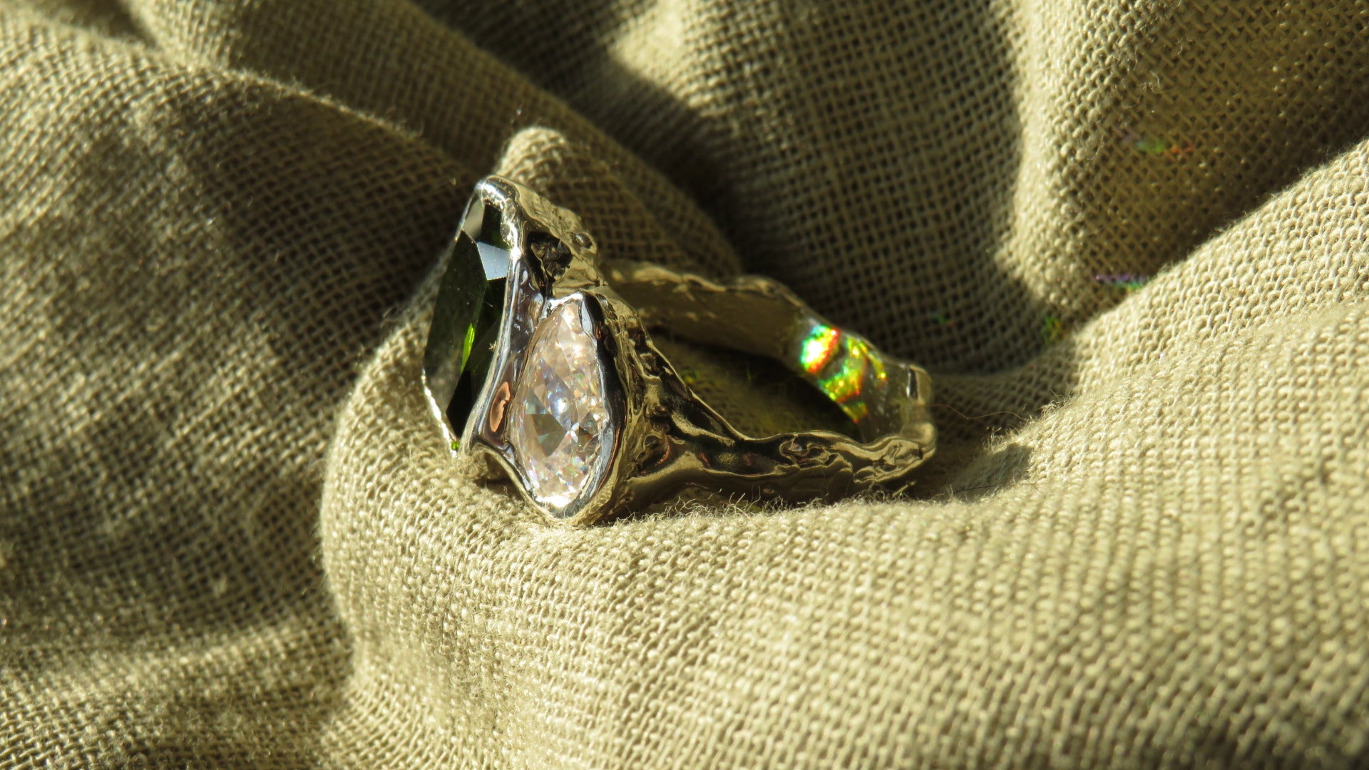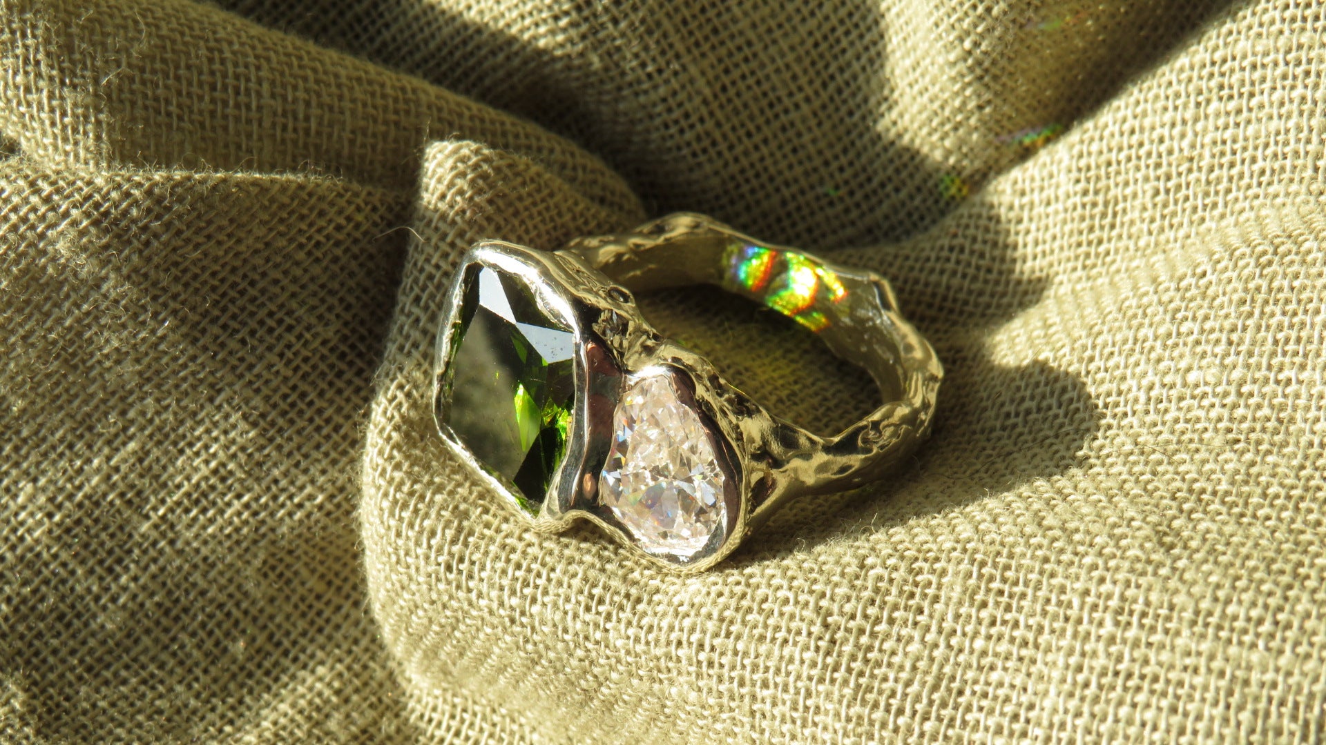 Introducing this beautiful hand crafted molten ring. This ring has been created using the lost wax casting method. Sculpted in wax and casted in Argentium Sterling Silver. This stunning piece holds a Olive green and a radiant white Cubic zirconia.