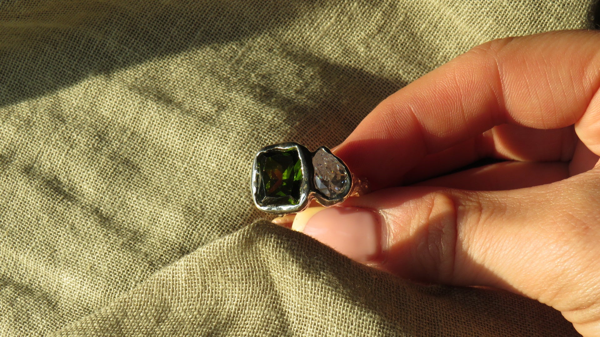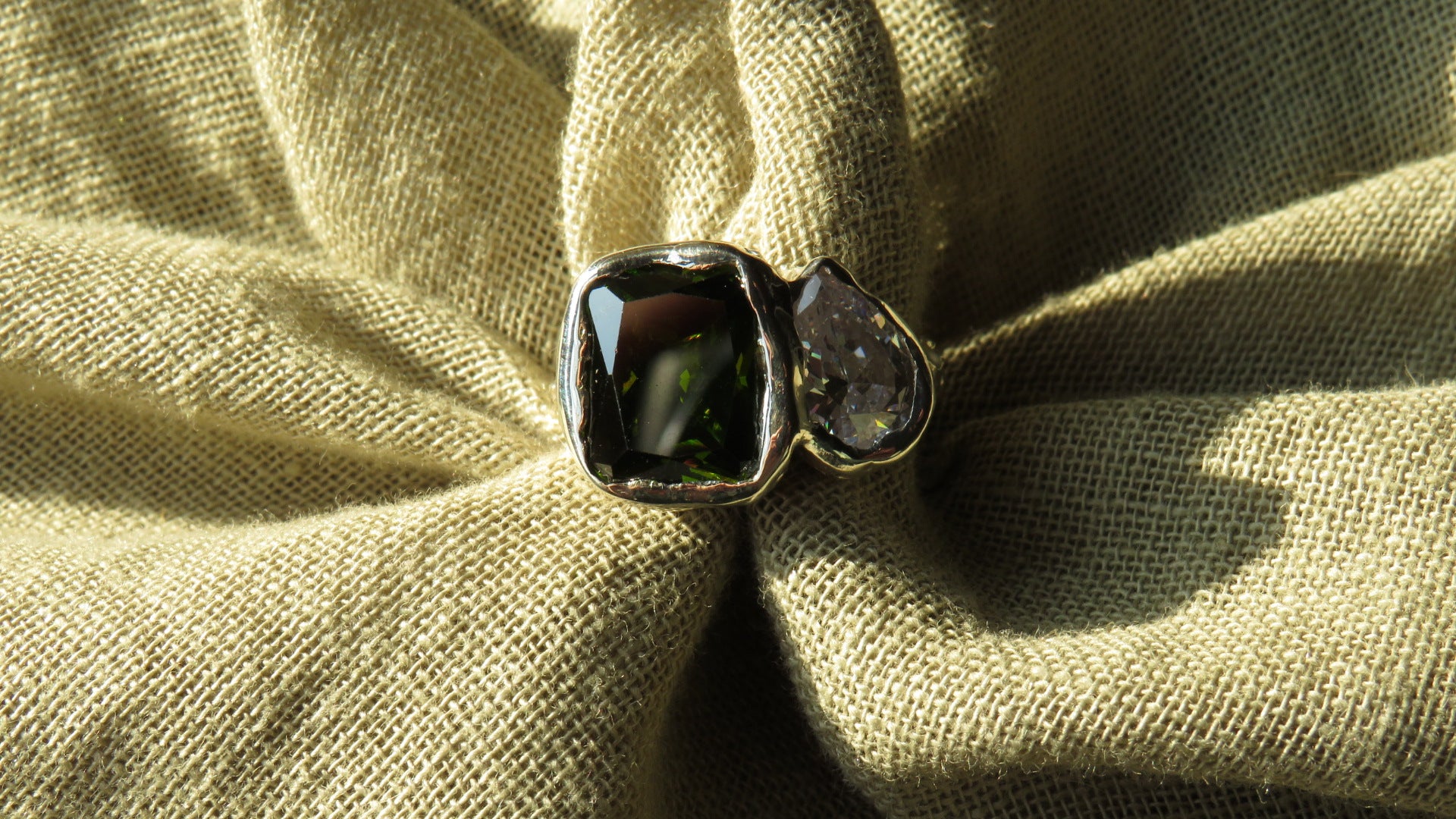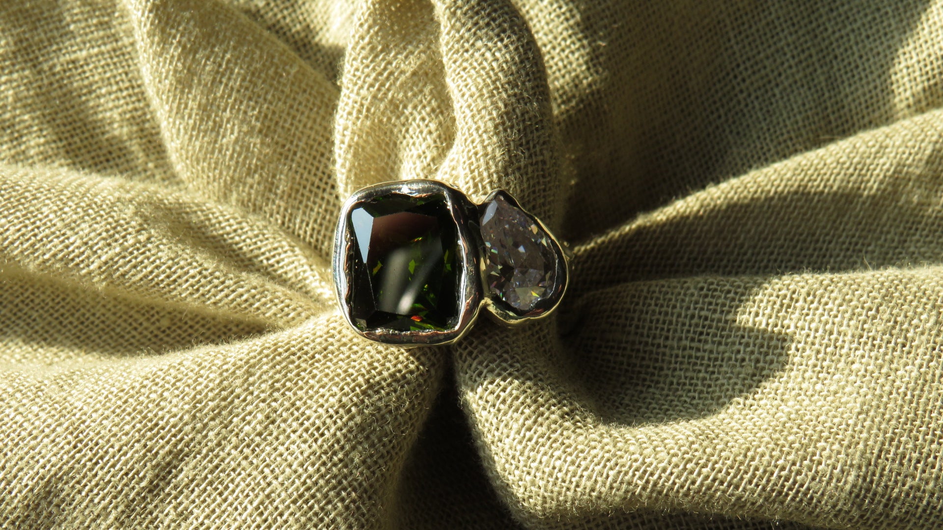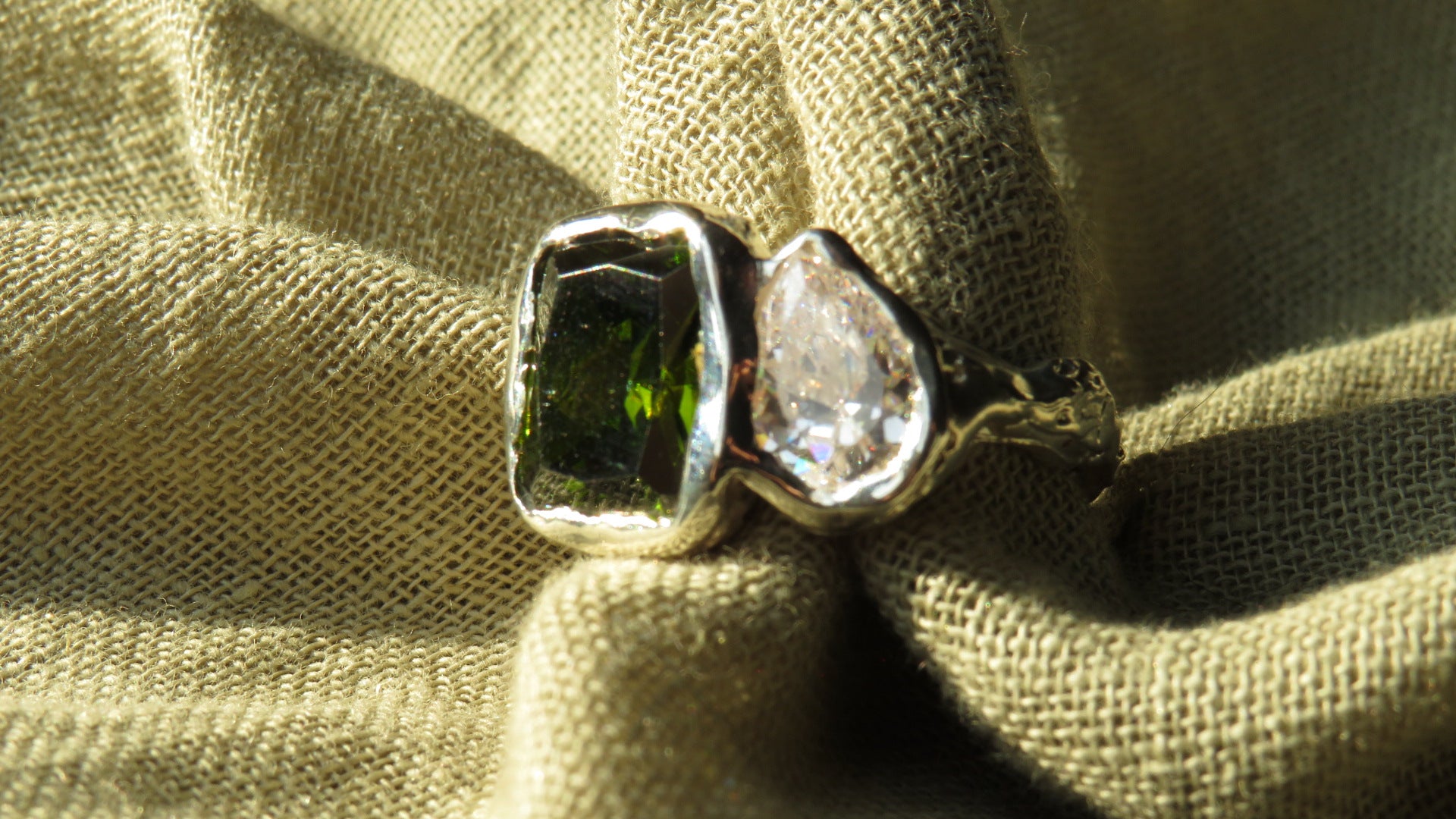 Introducing this beautiful hand crafted molten ring. This ring has been created using the lost wax casting method. Sculpted in wax and casted in Argentium Sterling Silver. This stunning piece holds a Olive green and a radiant white Cubic zirconia.