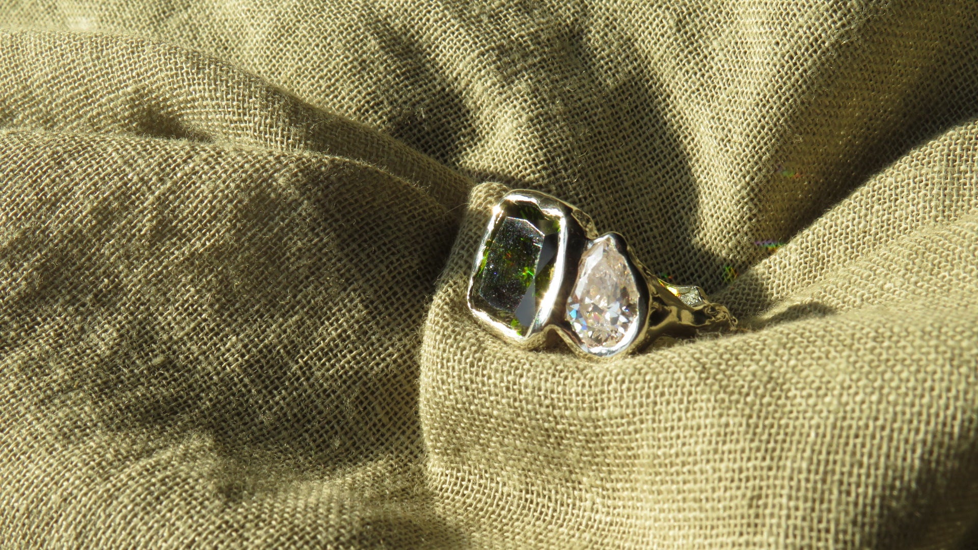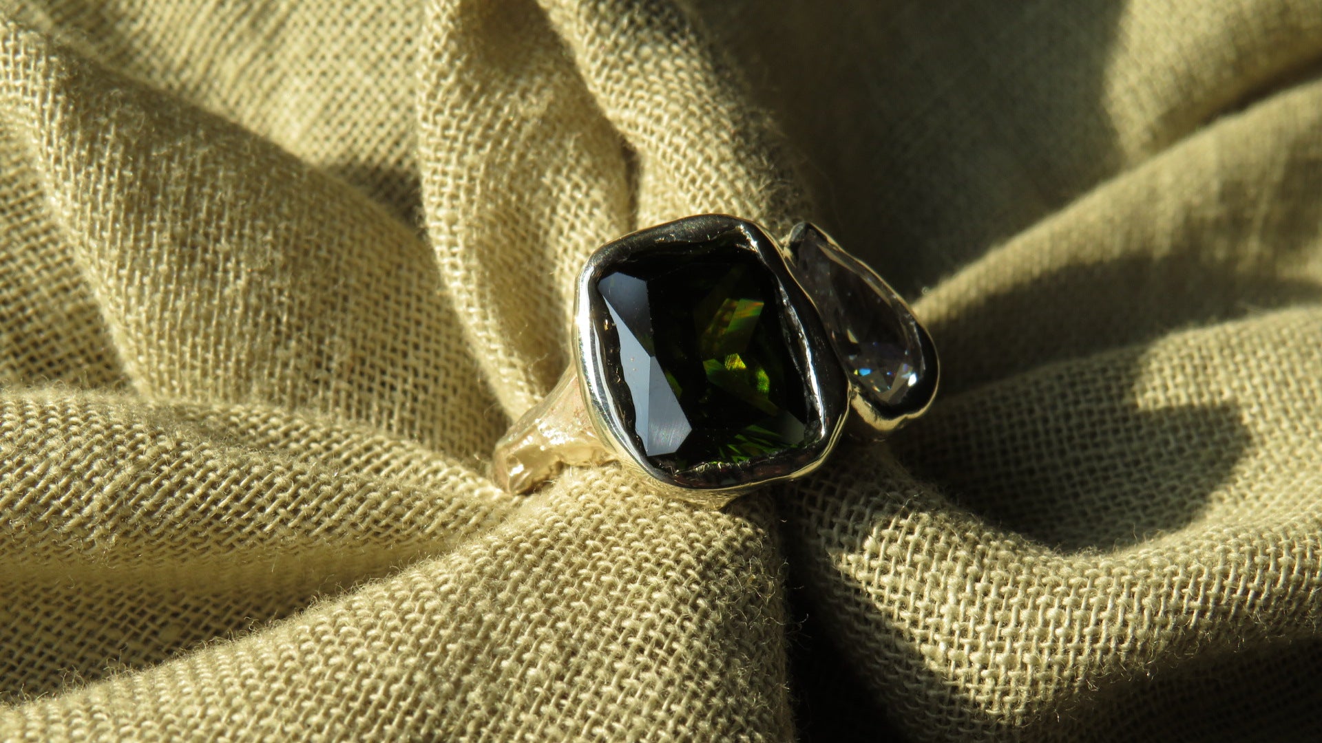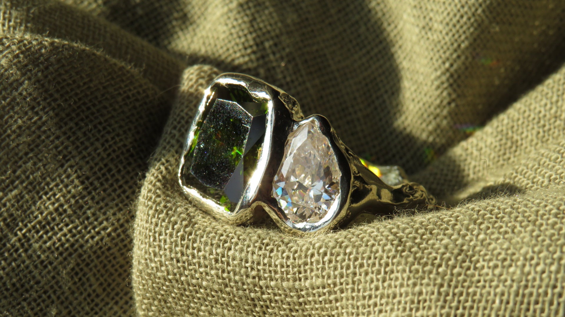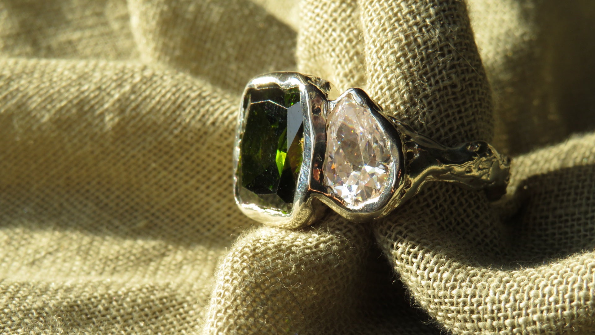 Introducing this beautiful hand crafted molten ring. This ring has been created using the lost wax casting method. Sculpted in wax and casted in Argentium Sterling Silver. This stunning piece holds a Olive green and a radiant white Cubic zirconia.