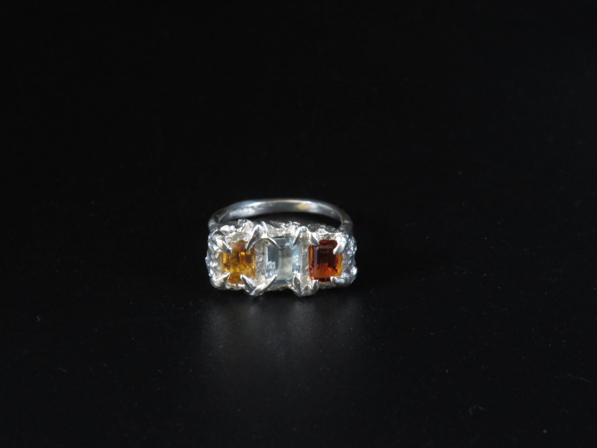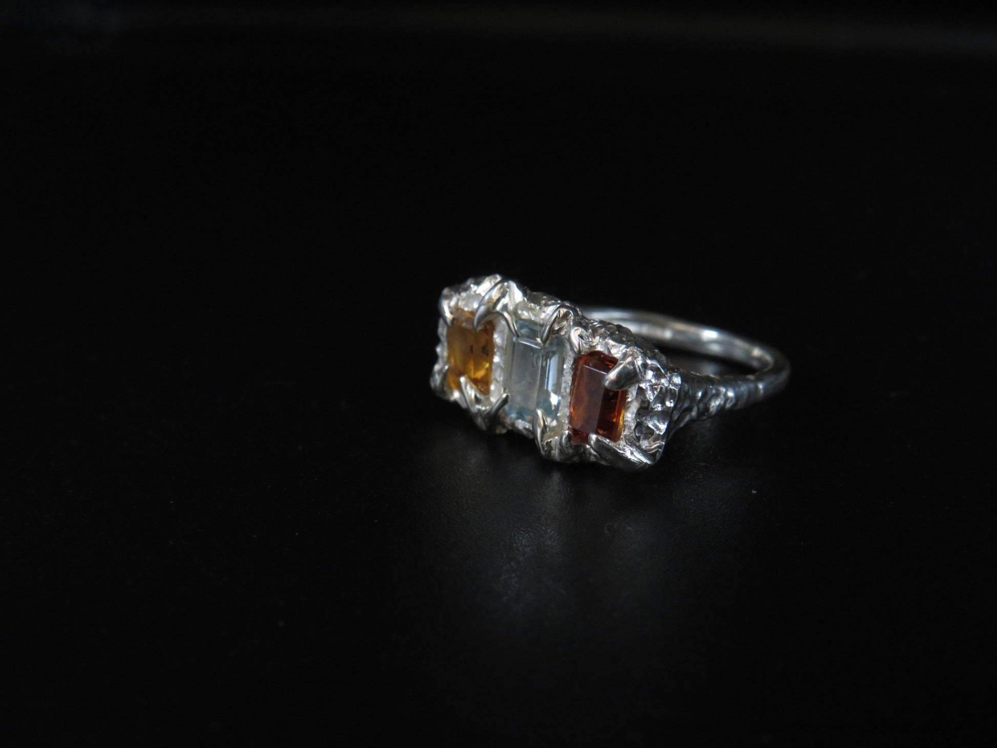 This handmade sterling silver ring holds a beautiful Aquamarine stone accompanied by two different toned Citrine either side. The ring has been designed around these stones. Textured top with a smooth band.