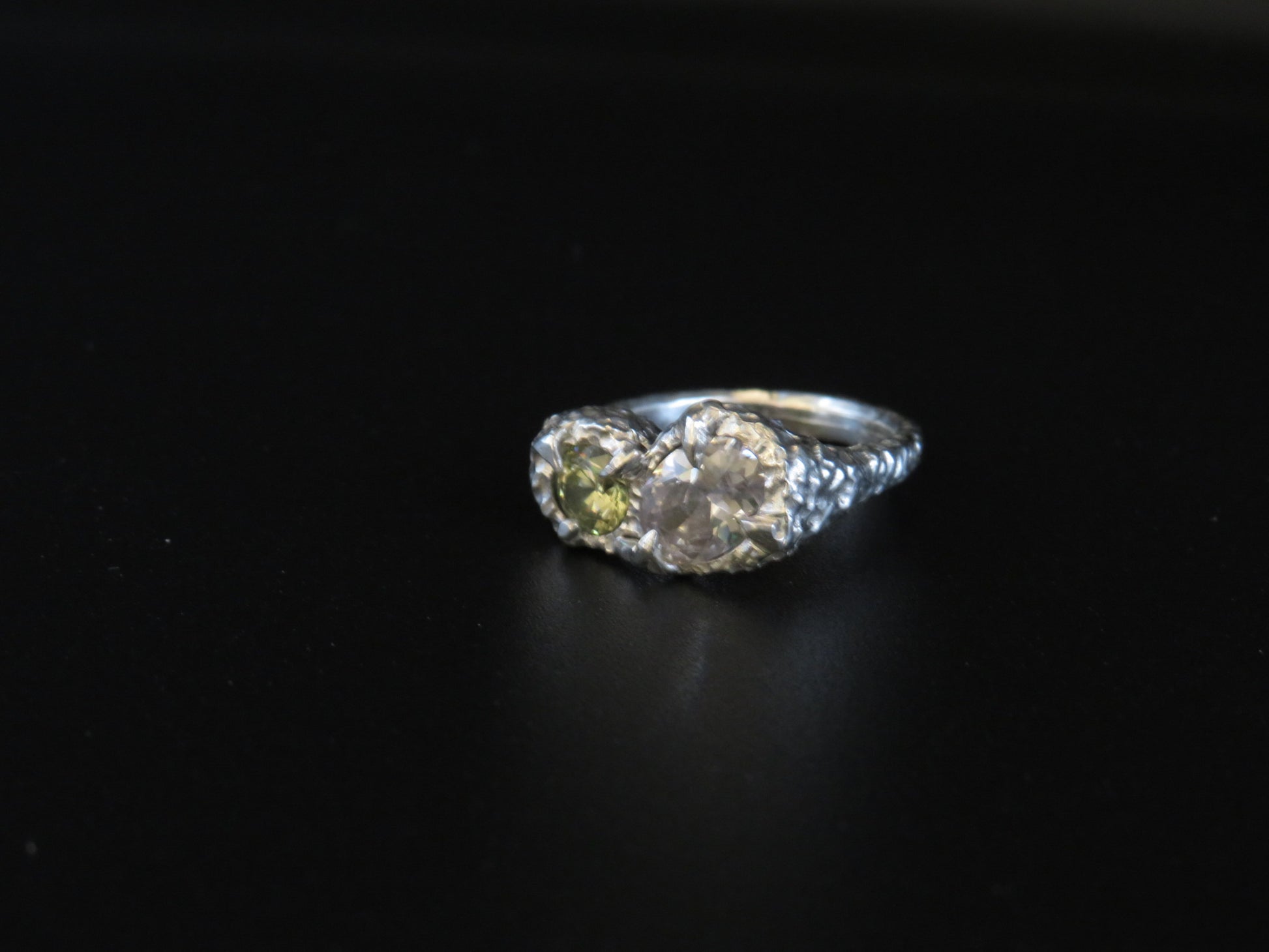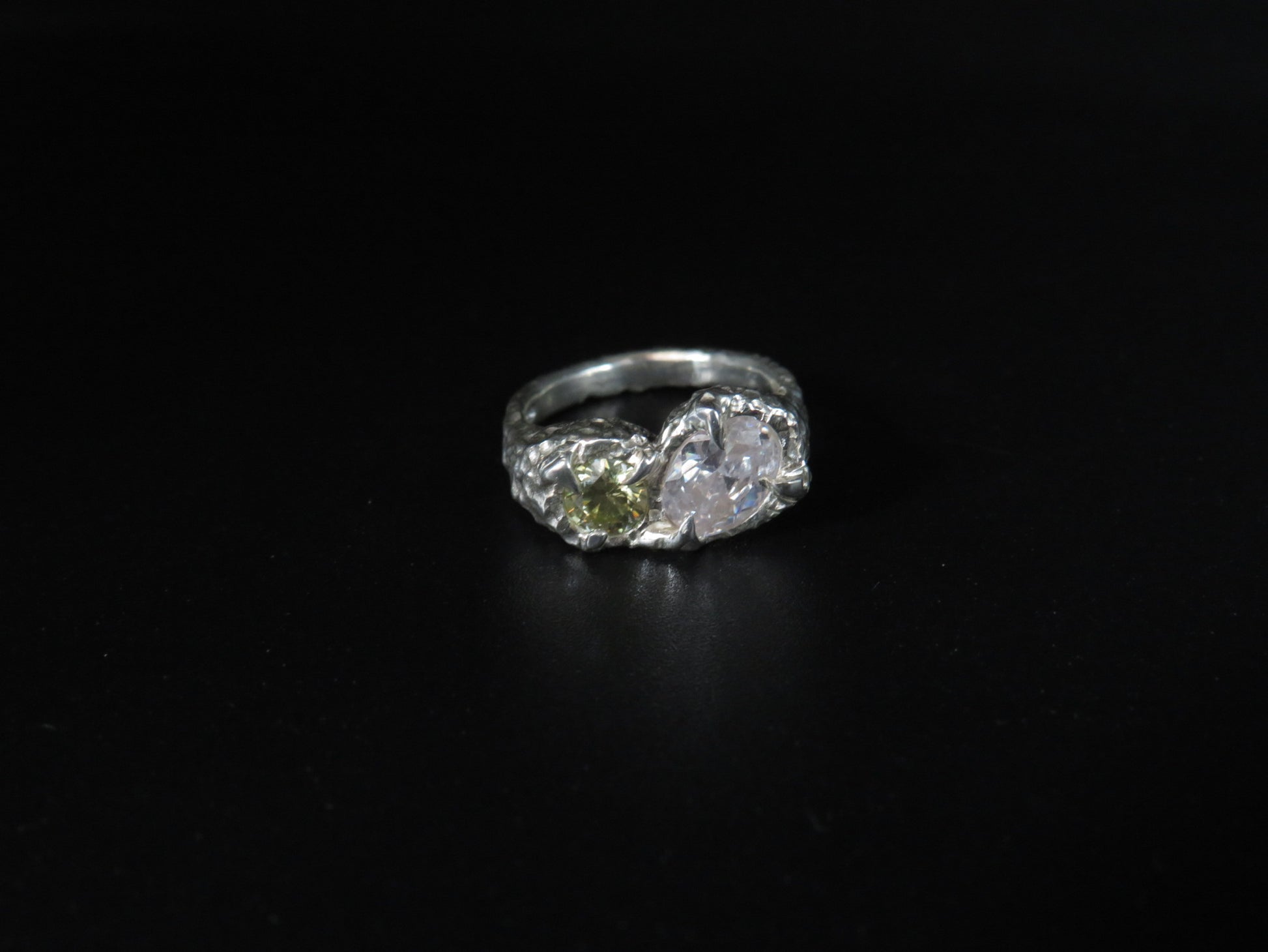 This stunning Astra ring is a handmade sterling silver ring, hugging two cubic zirconia stones surrounded by a textured band.