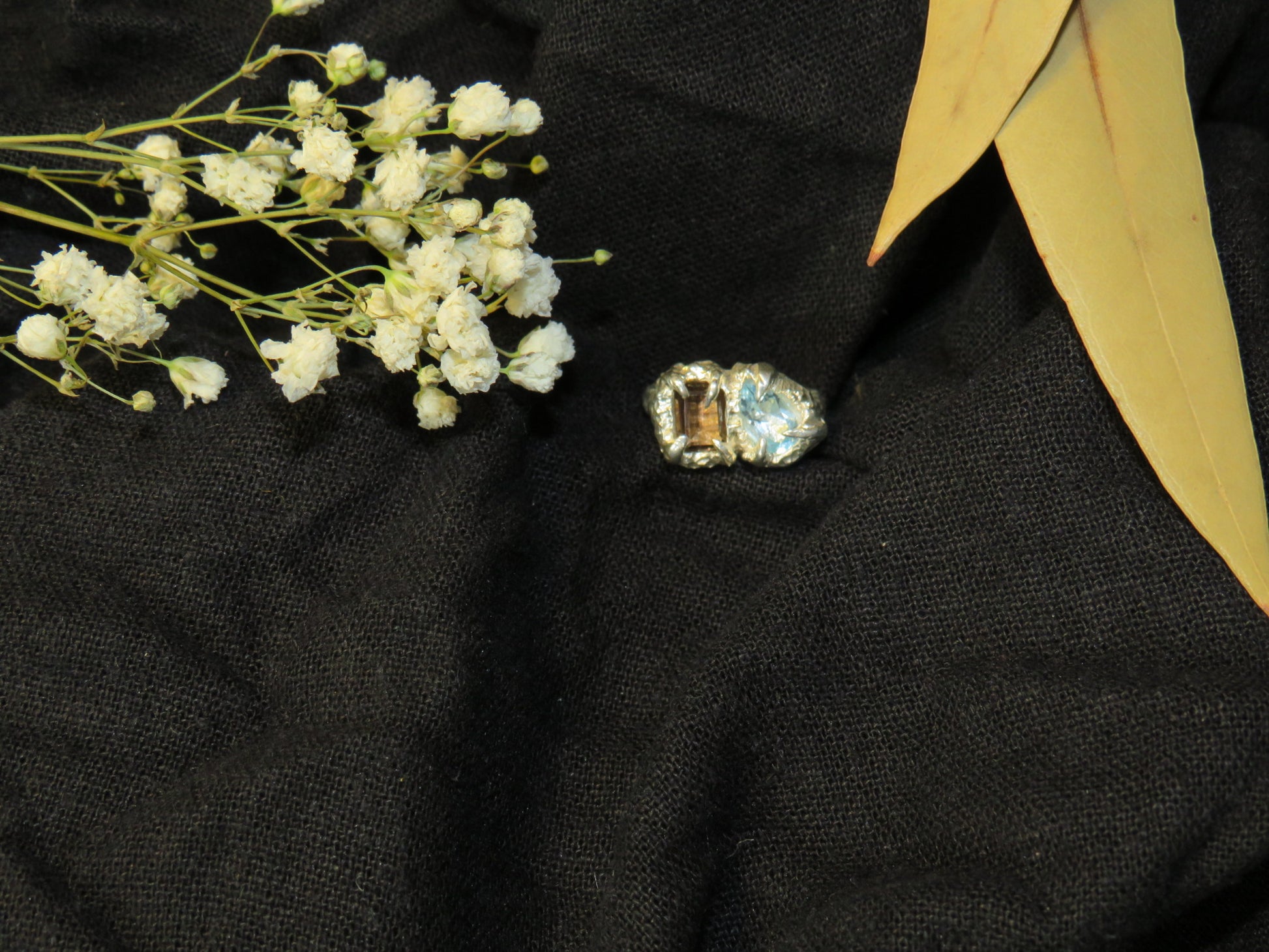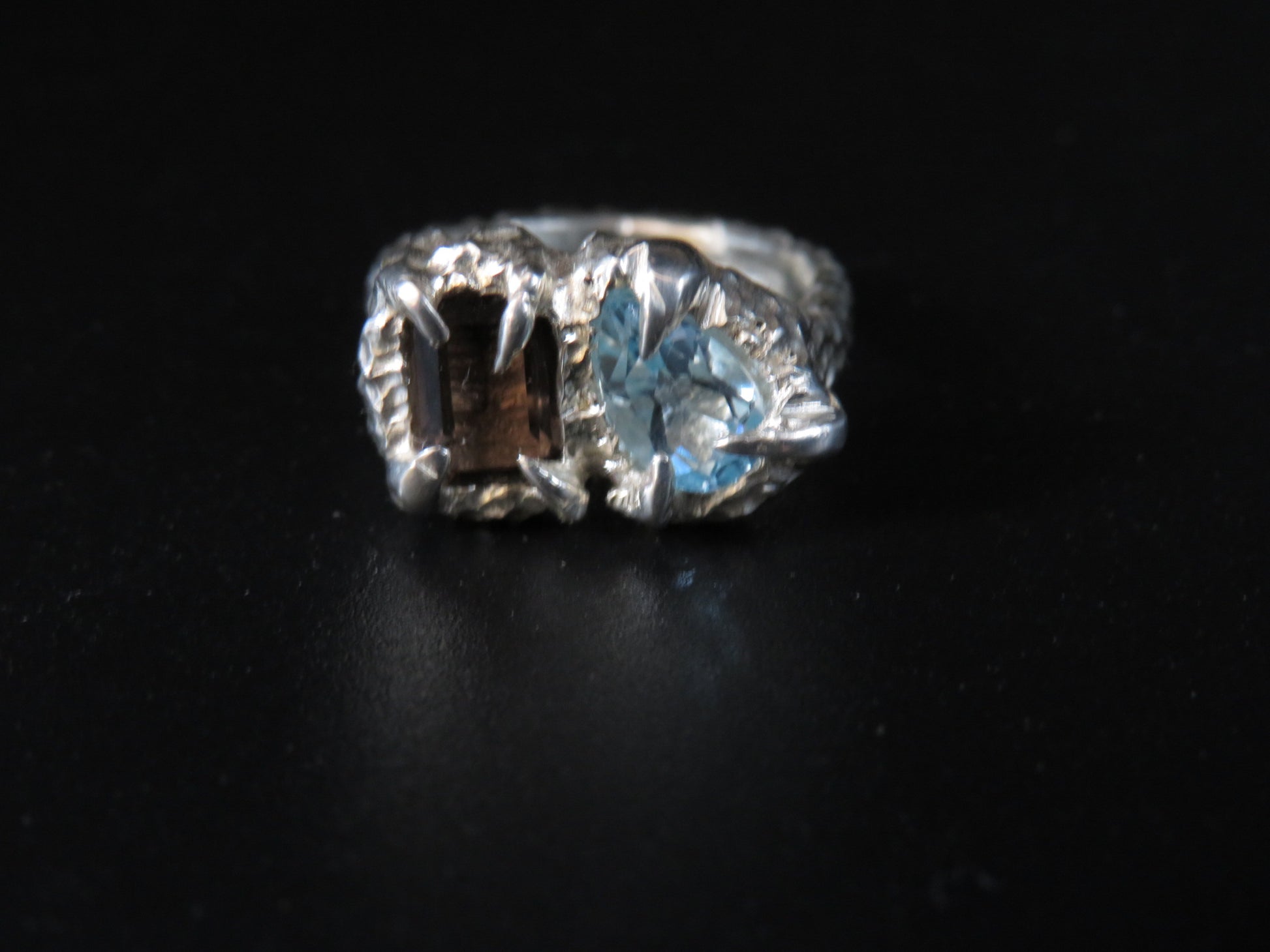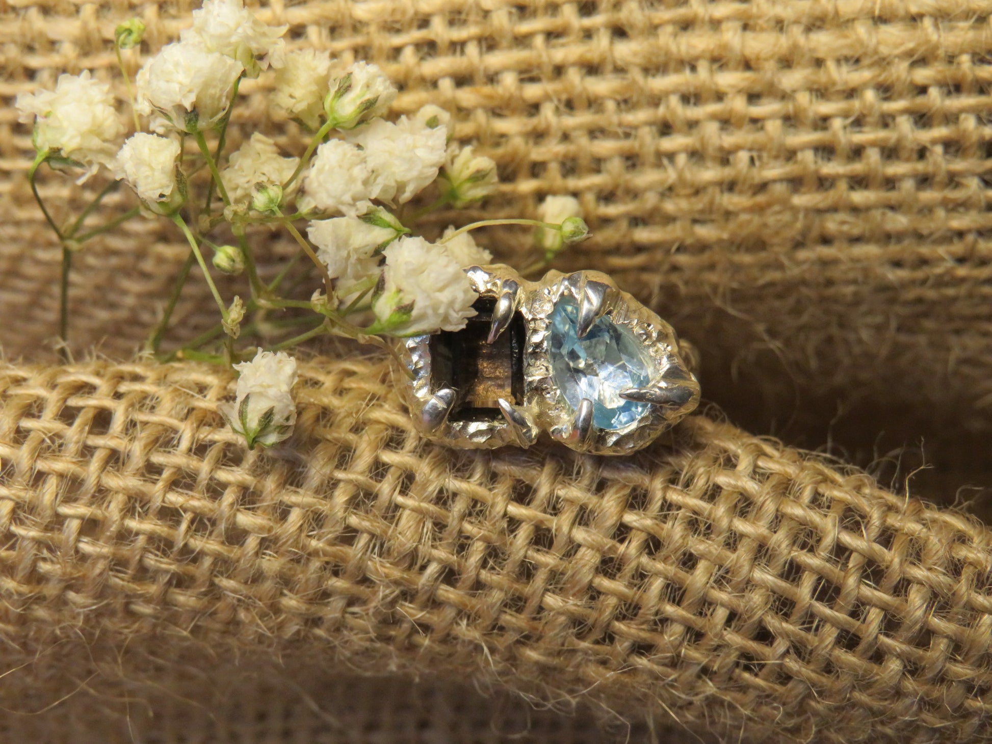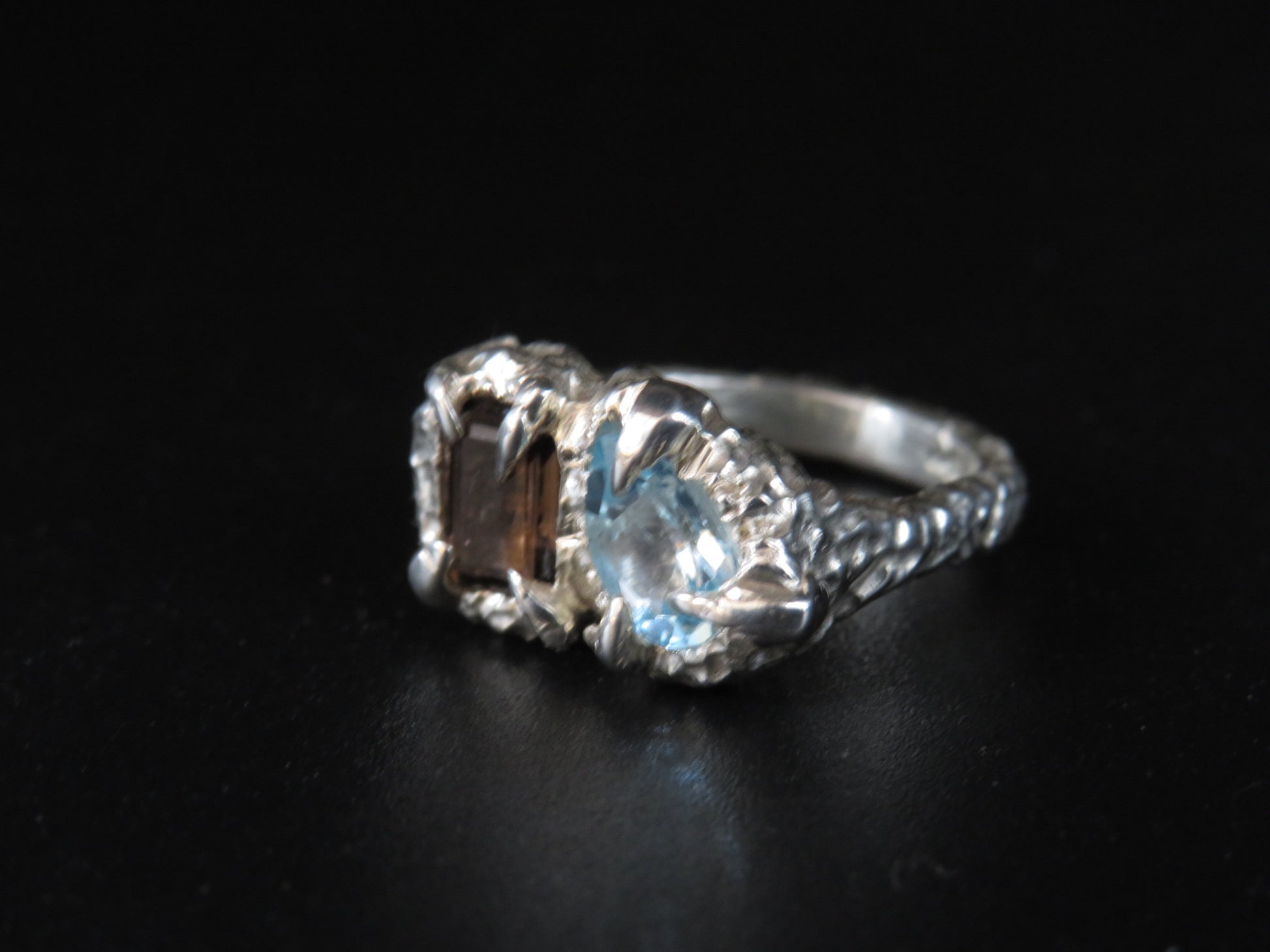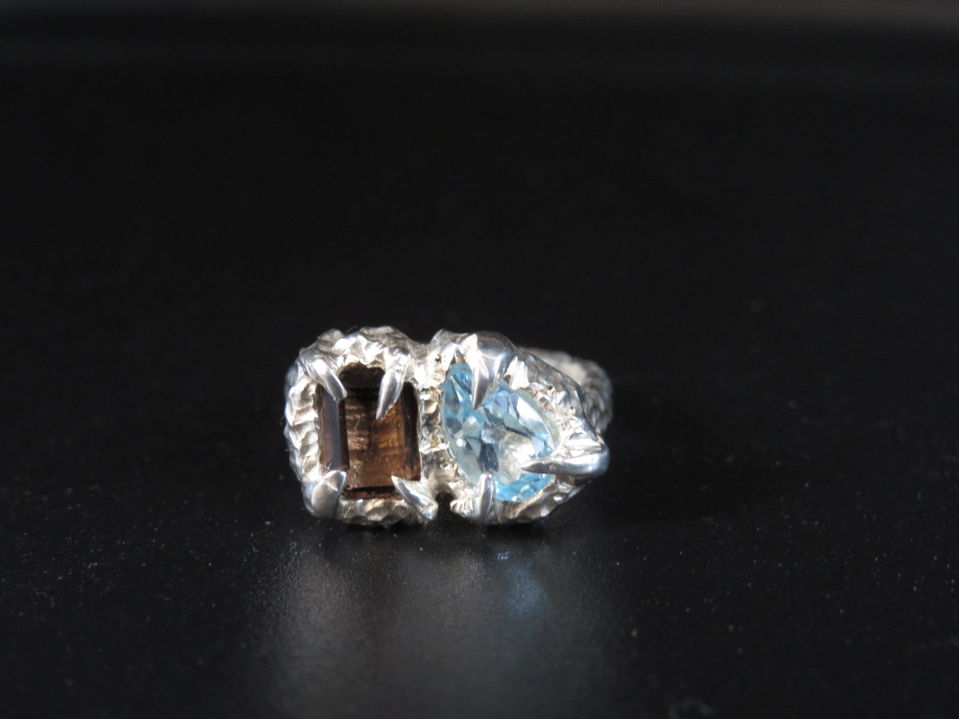 The Luna ring holds a beautiful SkyBlue Topaz, snuggled next to a Smokey Quartz. This ring was designed around the stones with a textured band.