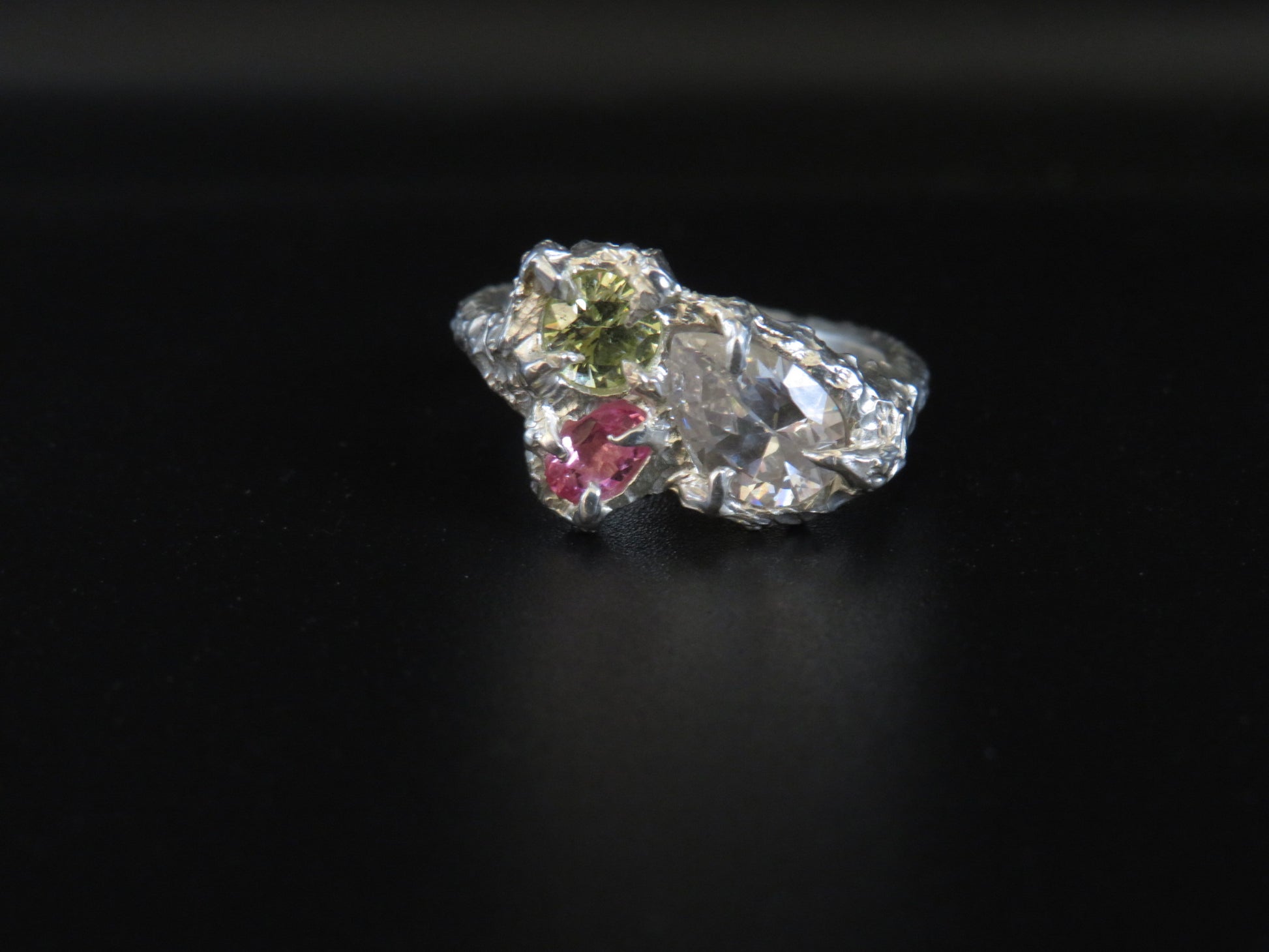 This handmade Sterling silver ring was inspired by the stones. The ring was formed around the positioning on these beautiful cubic zirconia stones.