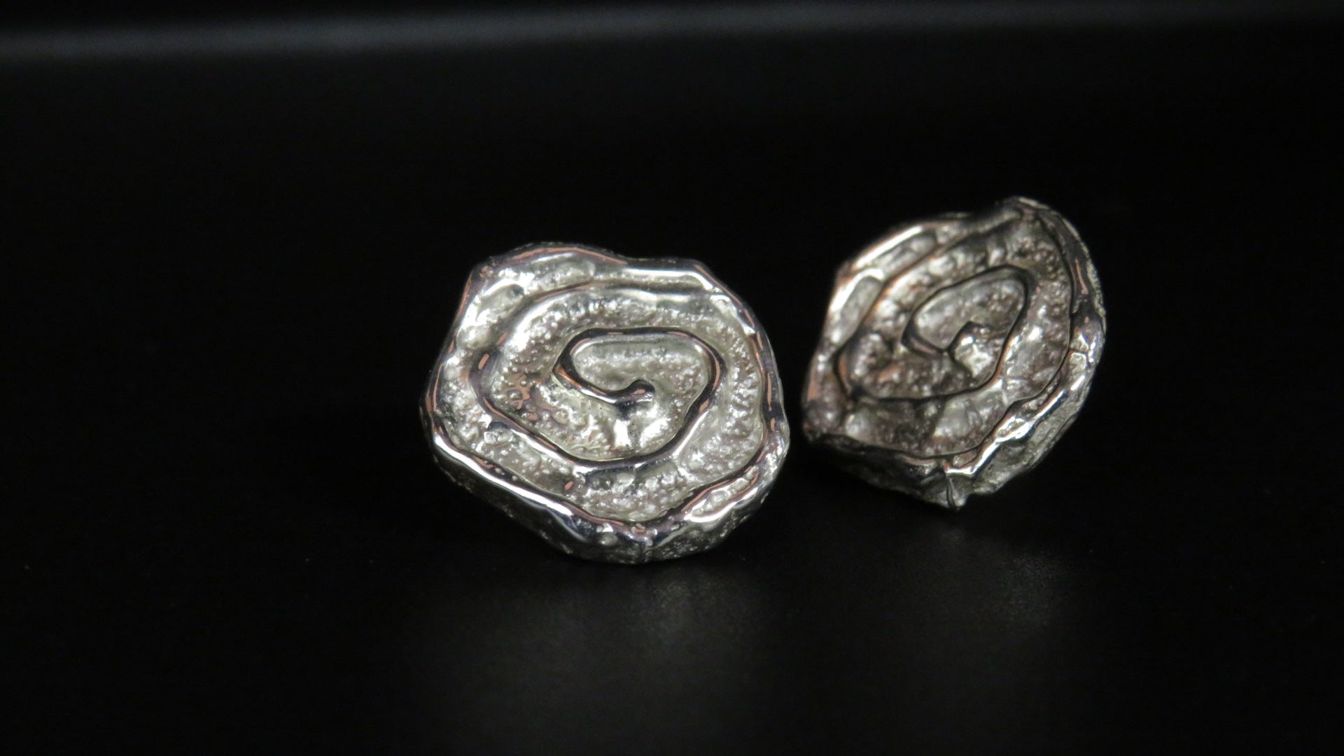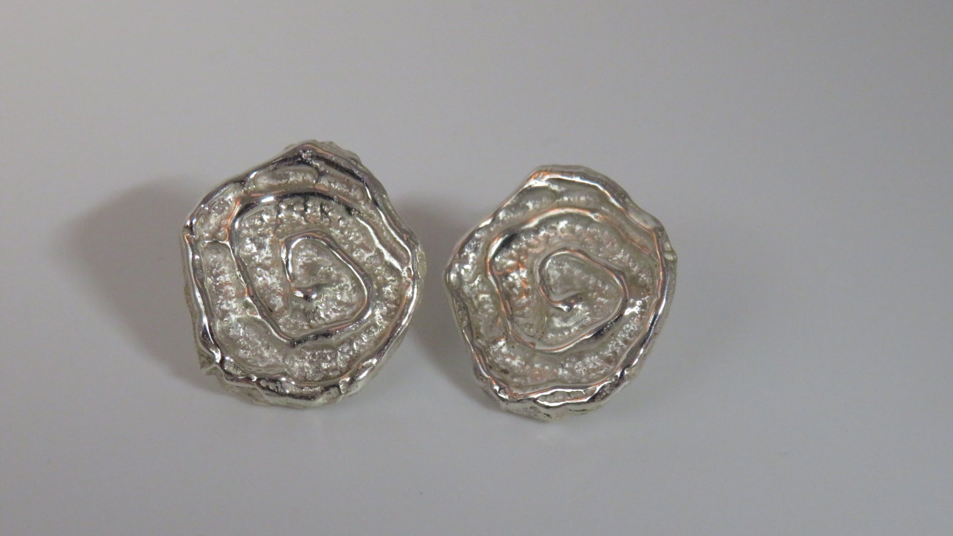 The base of the earrings have an organic grain to them with a high polished wavering spiral on top.