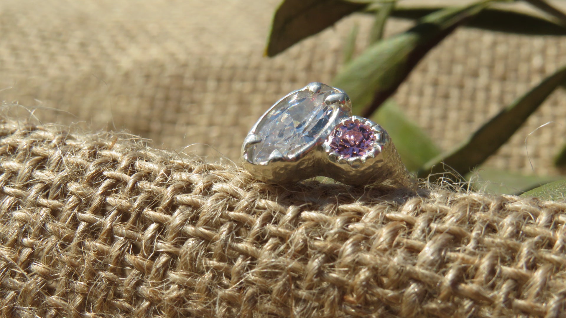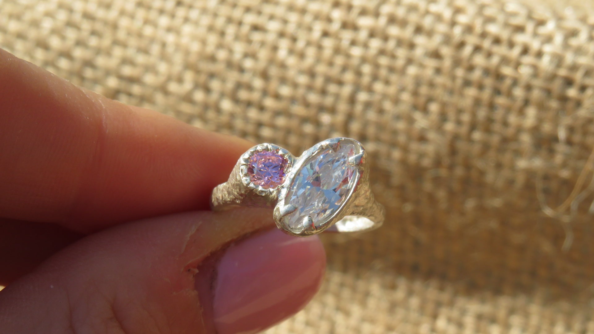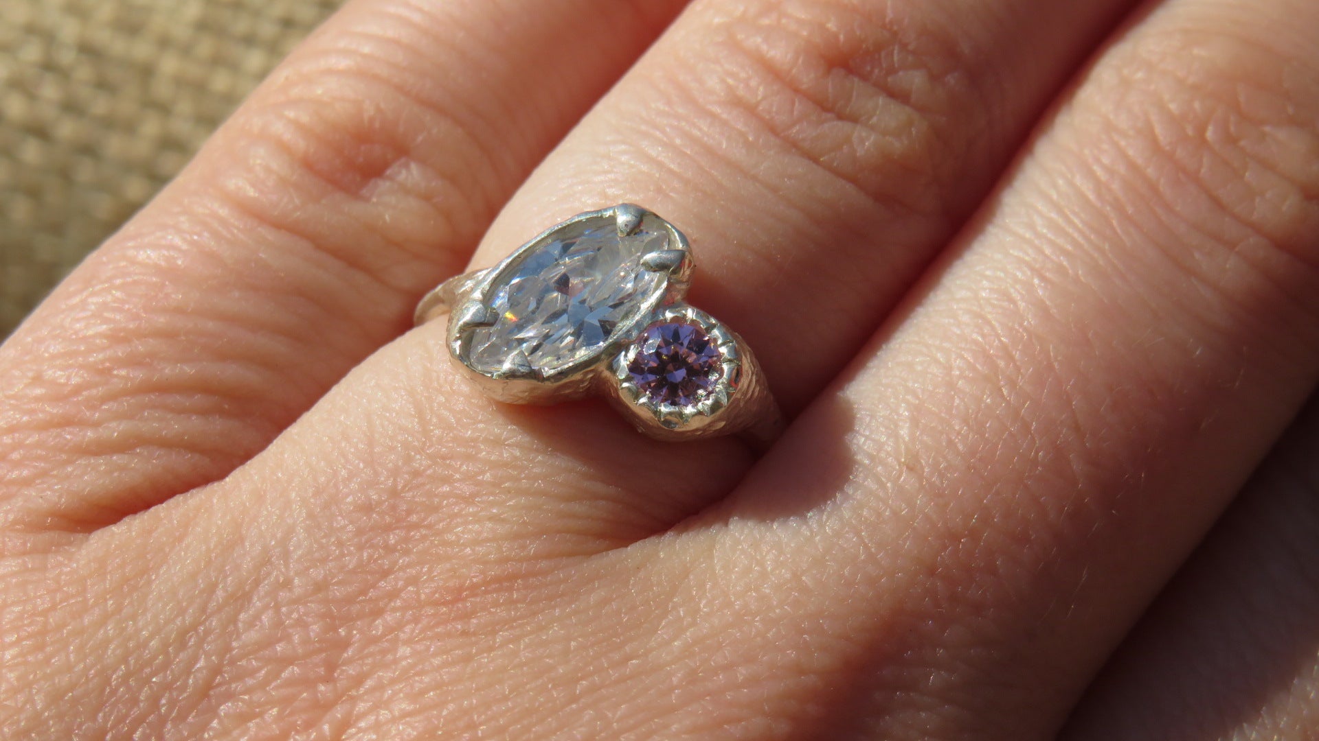 The Beautiful Odette ring. A handmade sterling silver ring holds two Cubic Zirconia stones surrounded by a textured band.