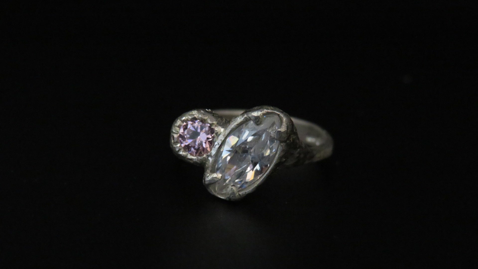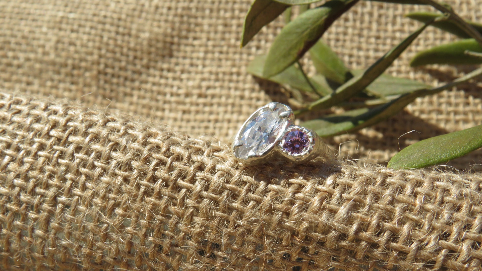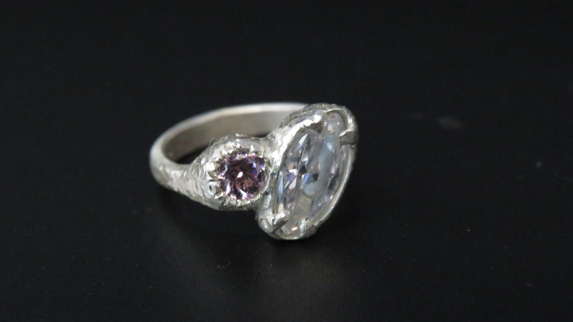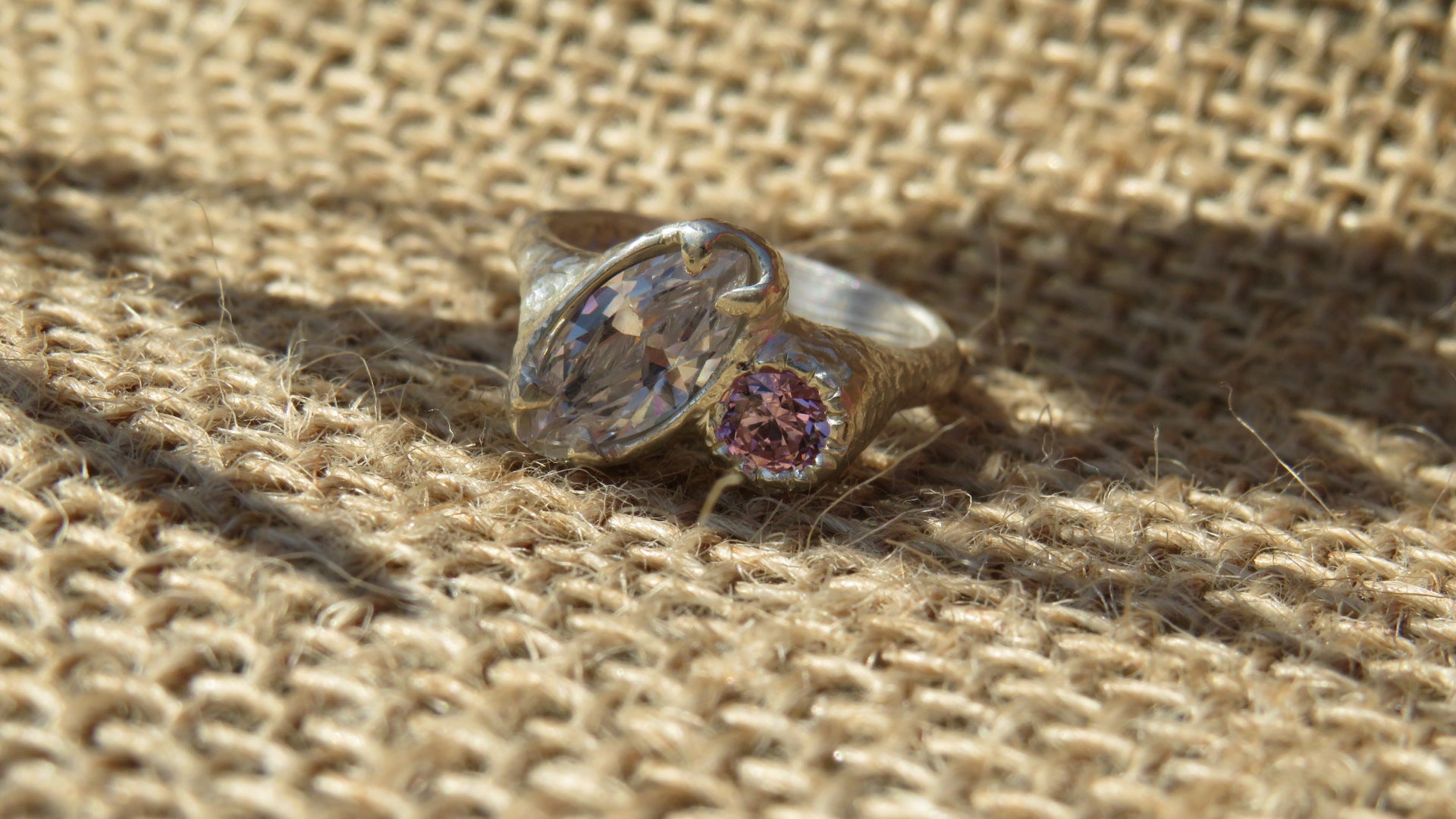 The Beautiful Odette ring. A handmade sterling silver ring holds two Cubic Zirconia stones surrounded by a textured band.