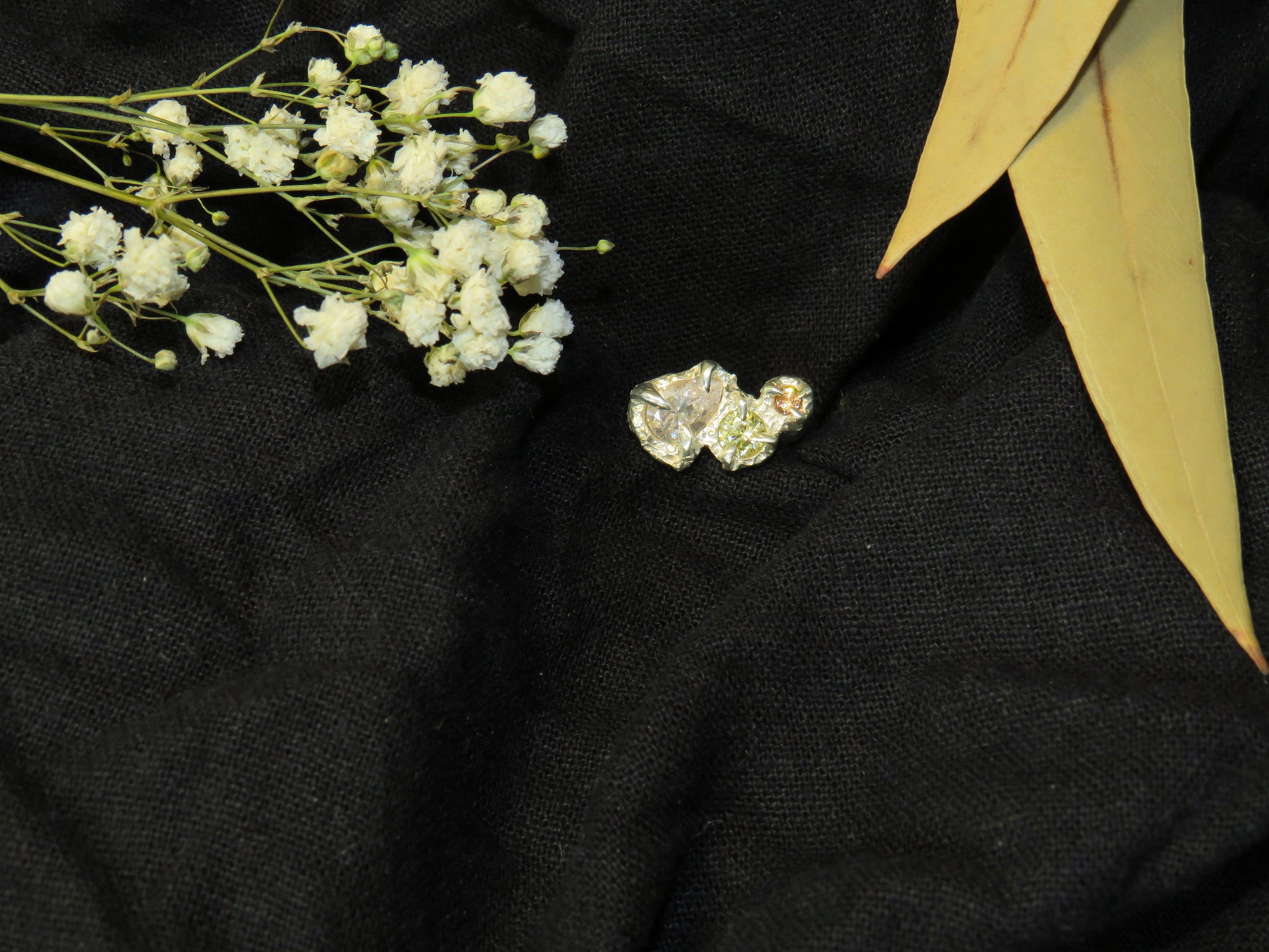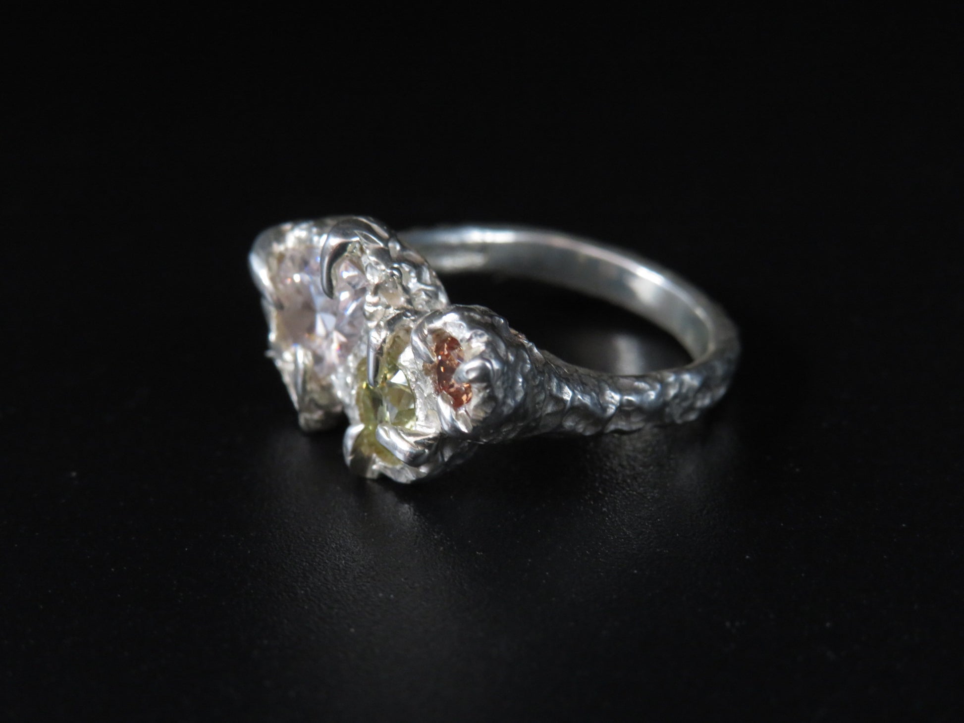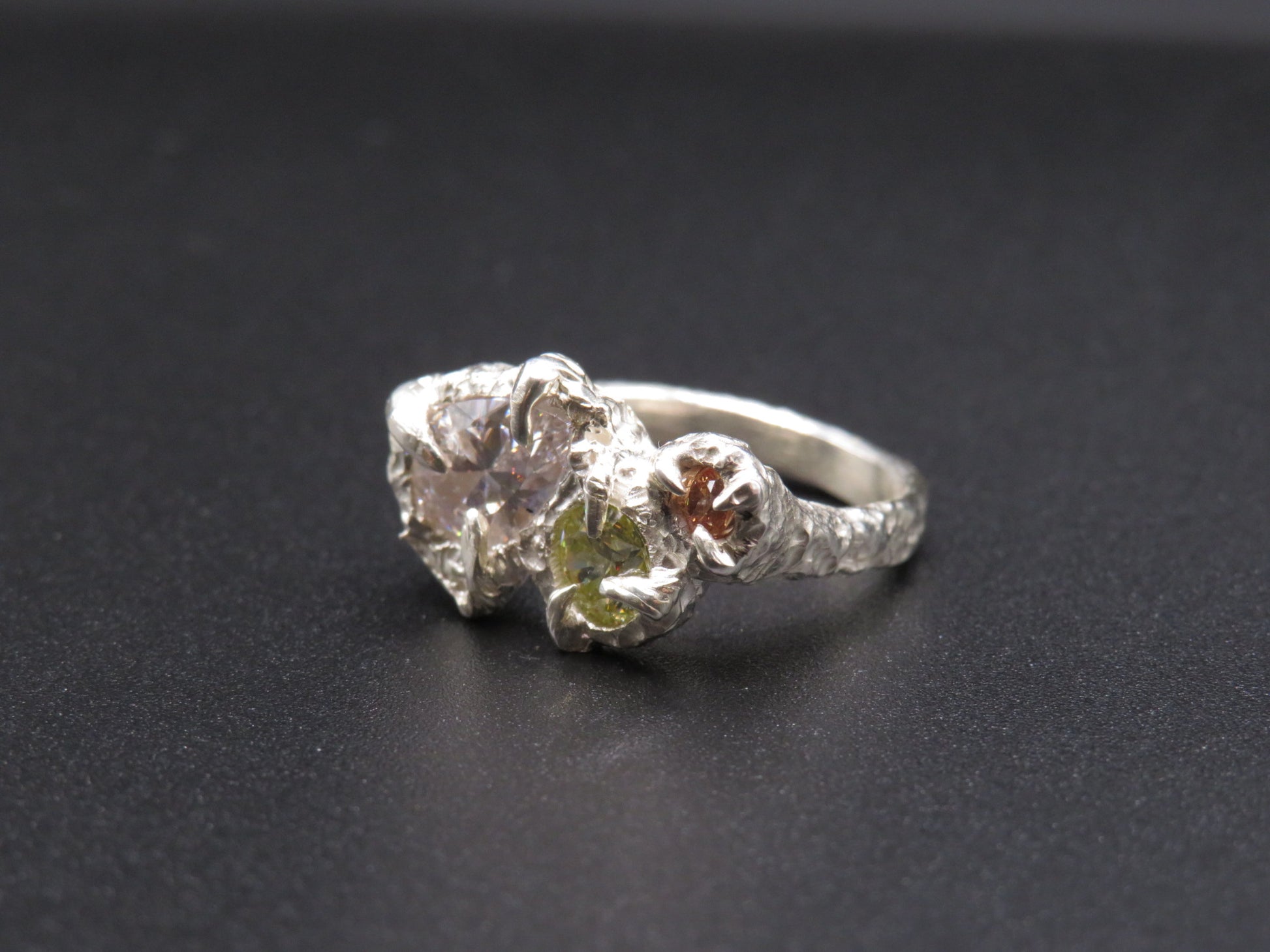 The Venus ring is a beautiful statement piece. This ring was designed around the stones with a textured band. Handmade in Yorkshire.