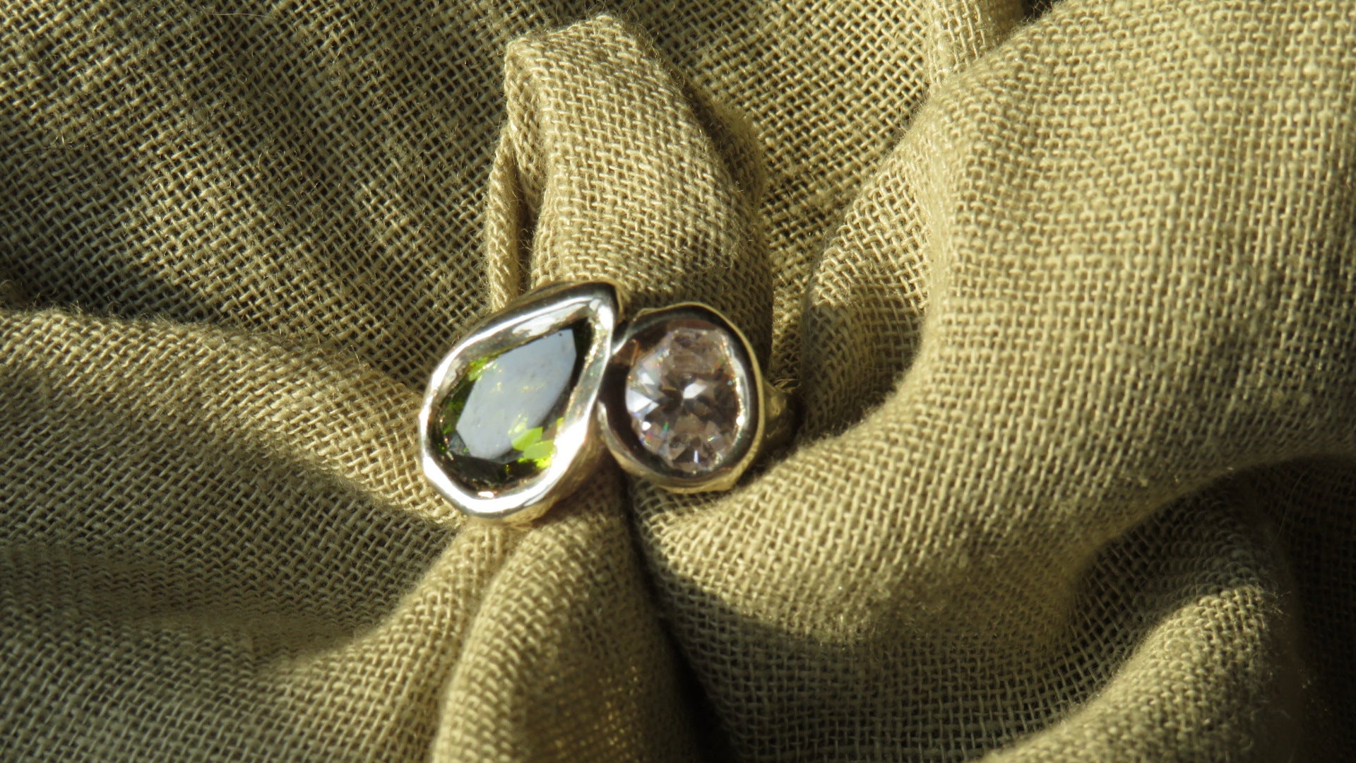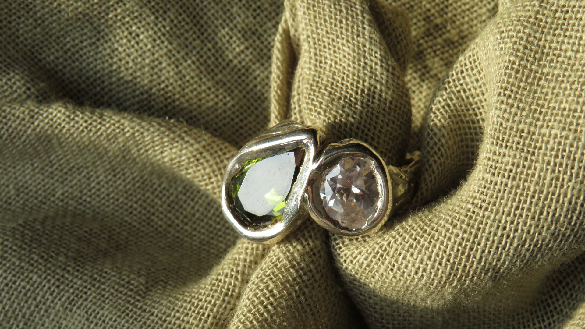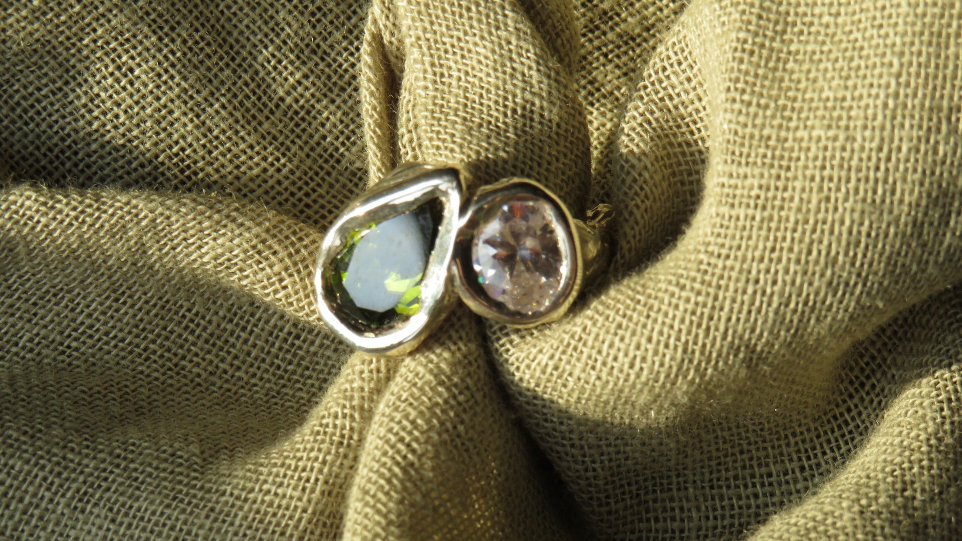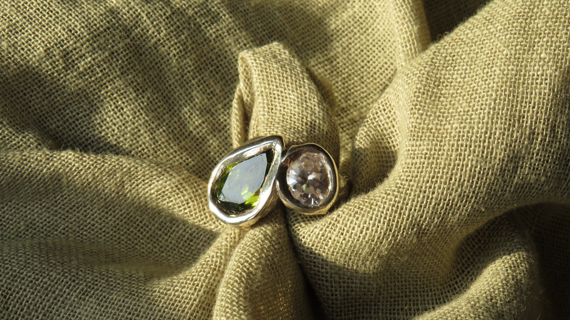 Introducing this beautiful hand crafted molten ring. This ring has been created using the lost wax casting method. Sculpted in wax and casted in Argentium Sterling Silver. This stunning piece holds a radiant Olive Cubic zirconia and a vibrant white cubic zirconia.