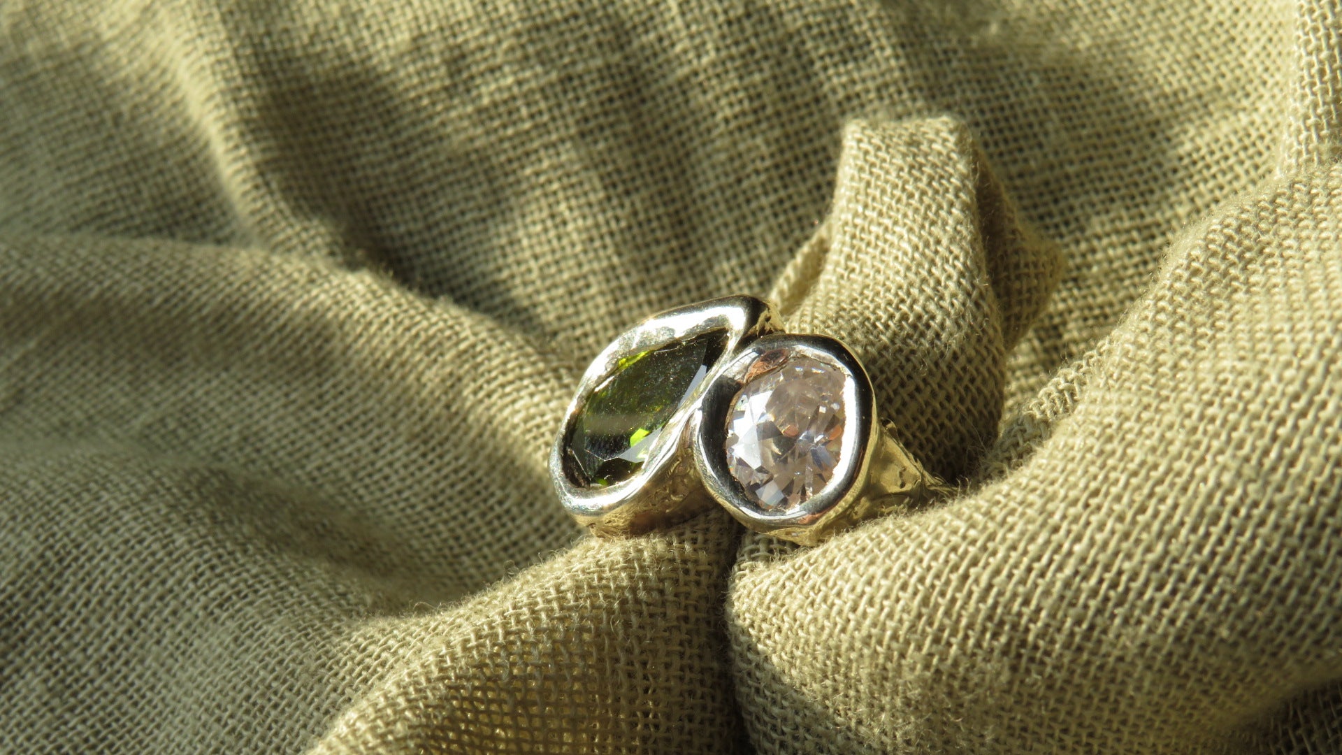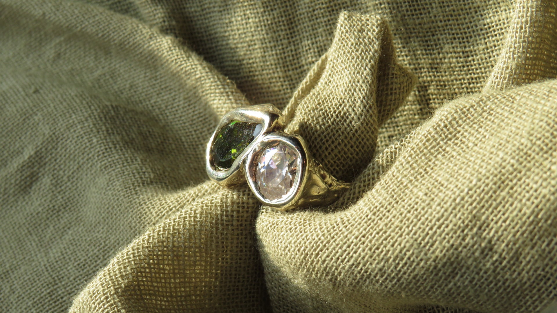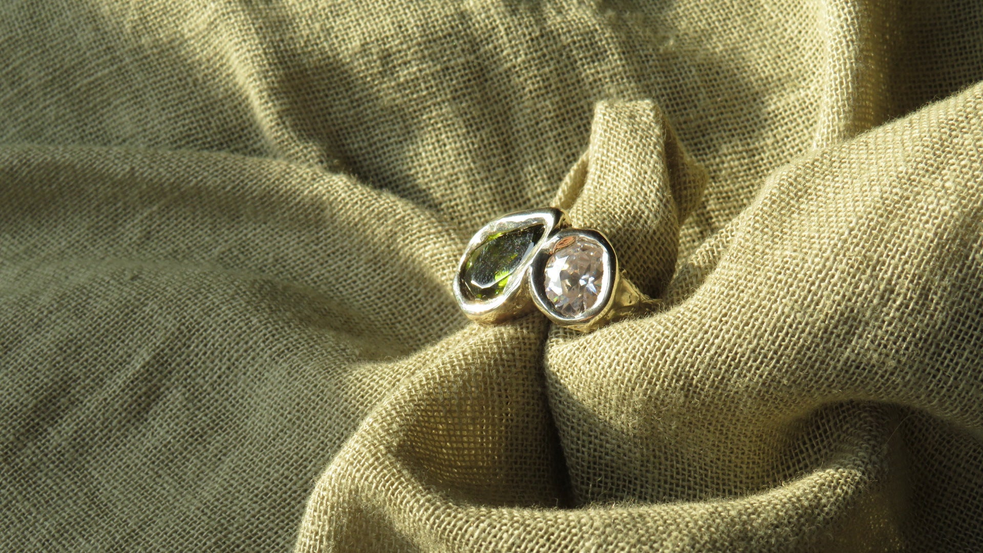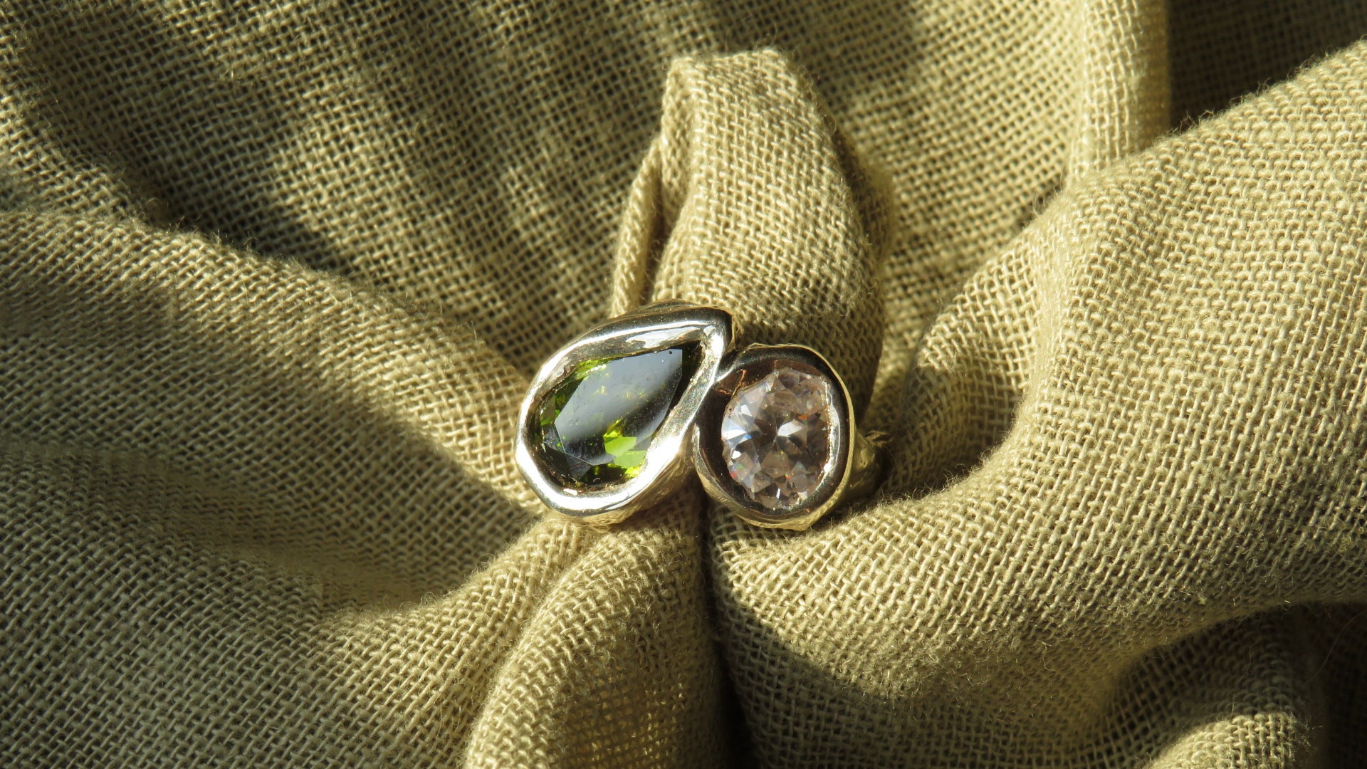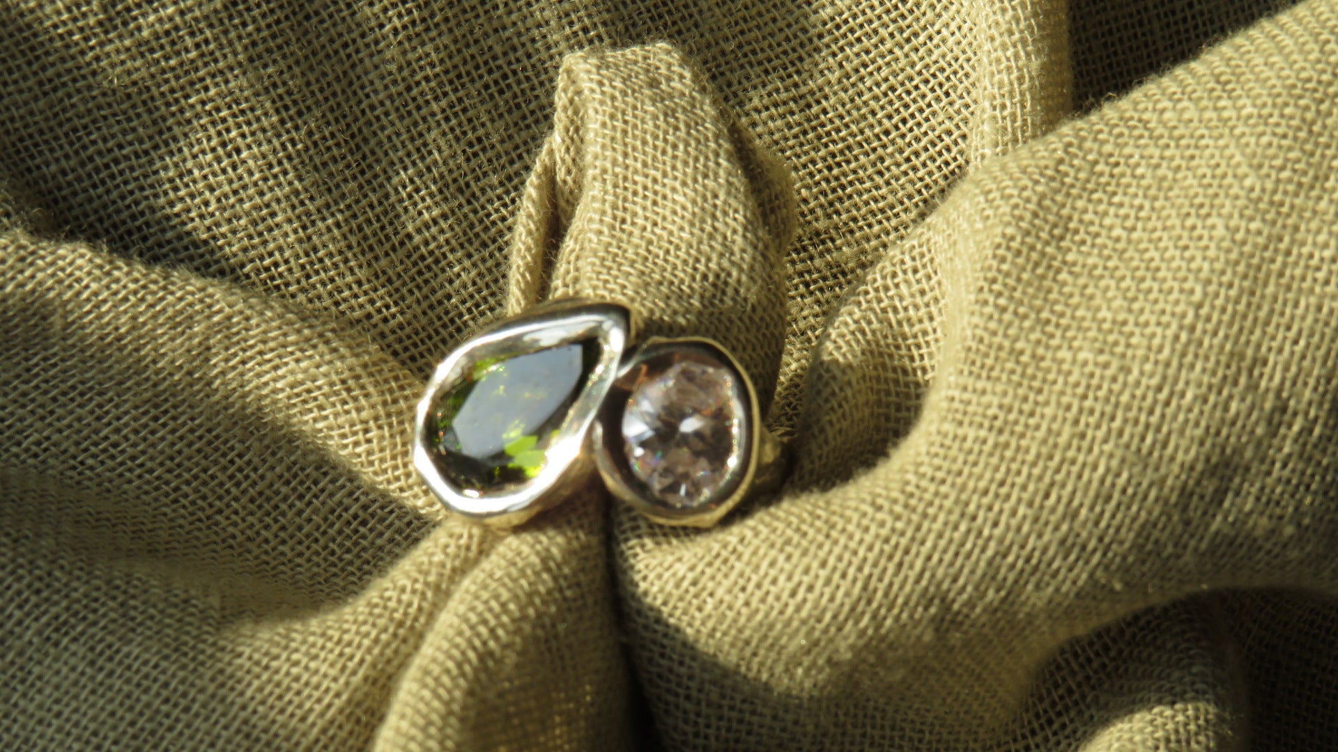 Introducing this beautiful hand crafted molten ring. This ring has been created using the lost wax casting method. Sculpted in wax and casted in Argentium Sterling Silver. This stunning piece holds a radiant Olive Cubic zirconia and a vibrant white cubic zirconia.