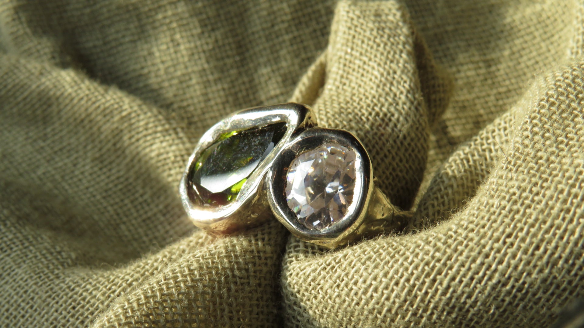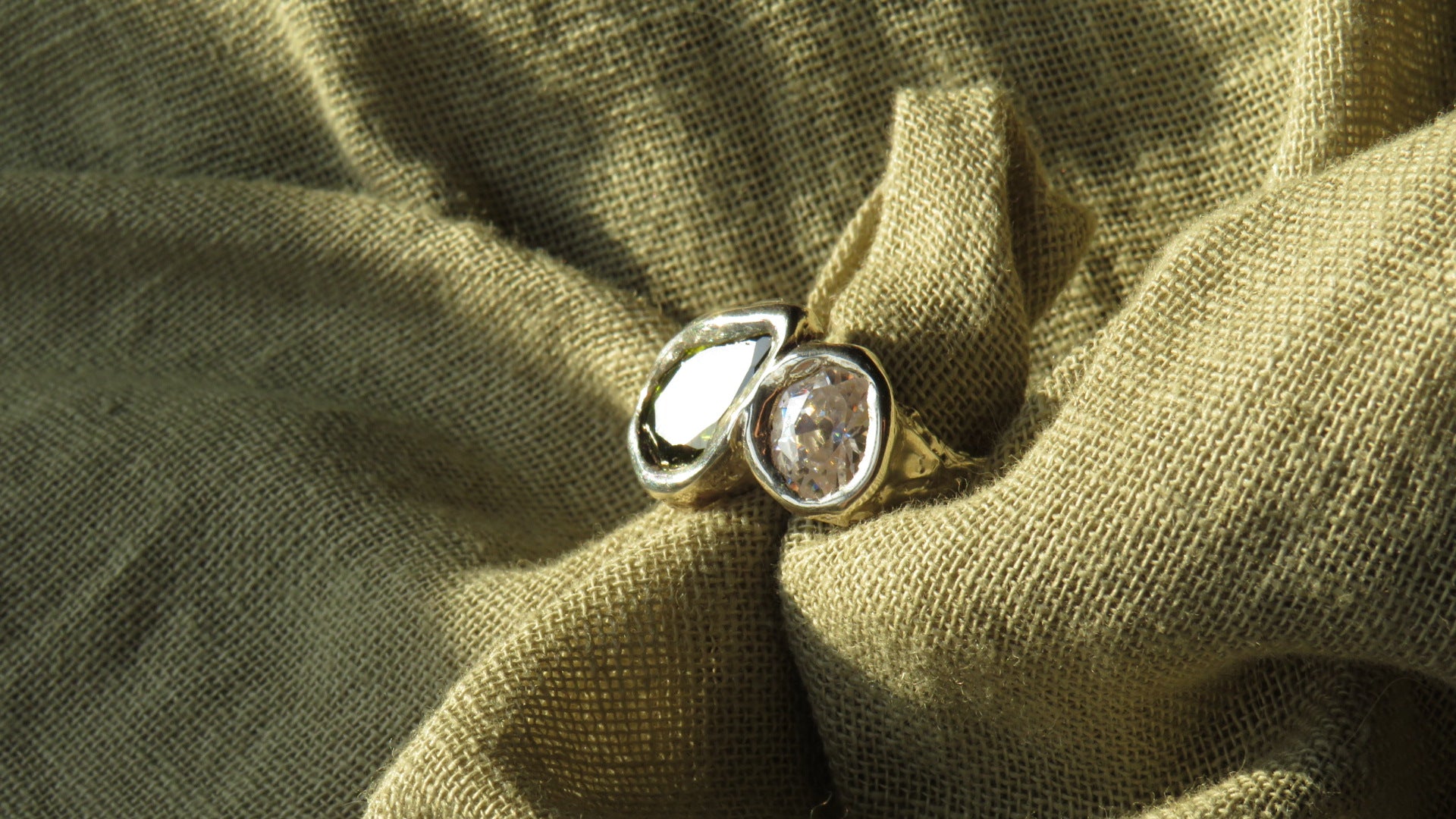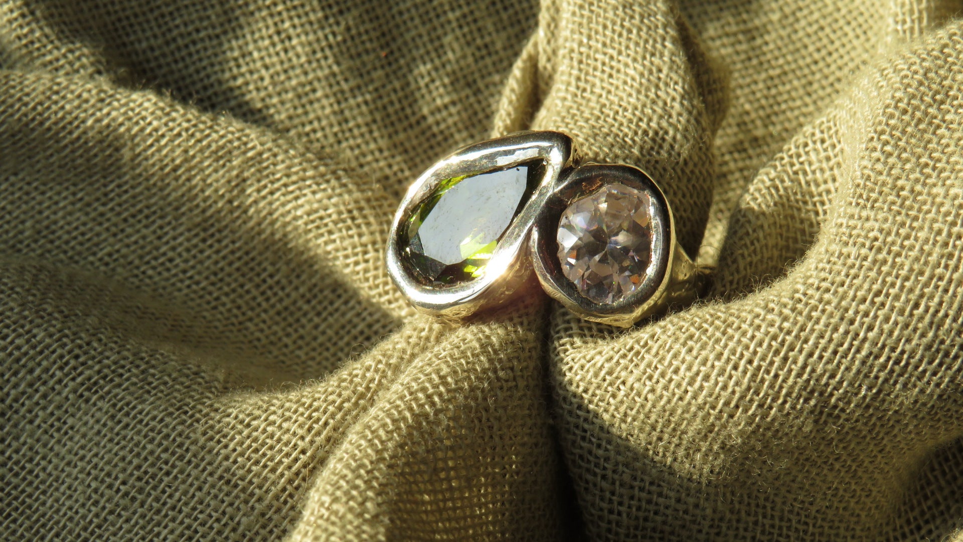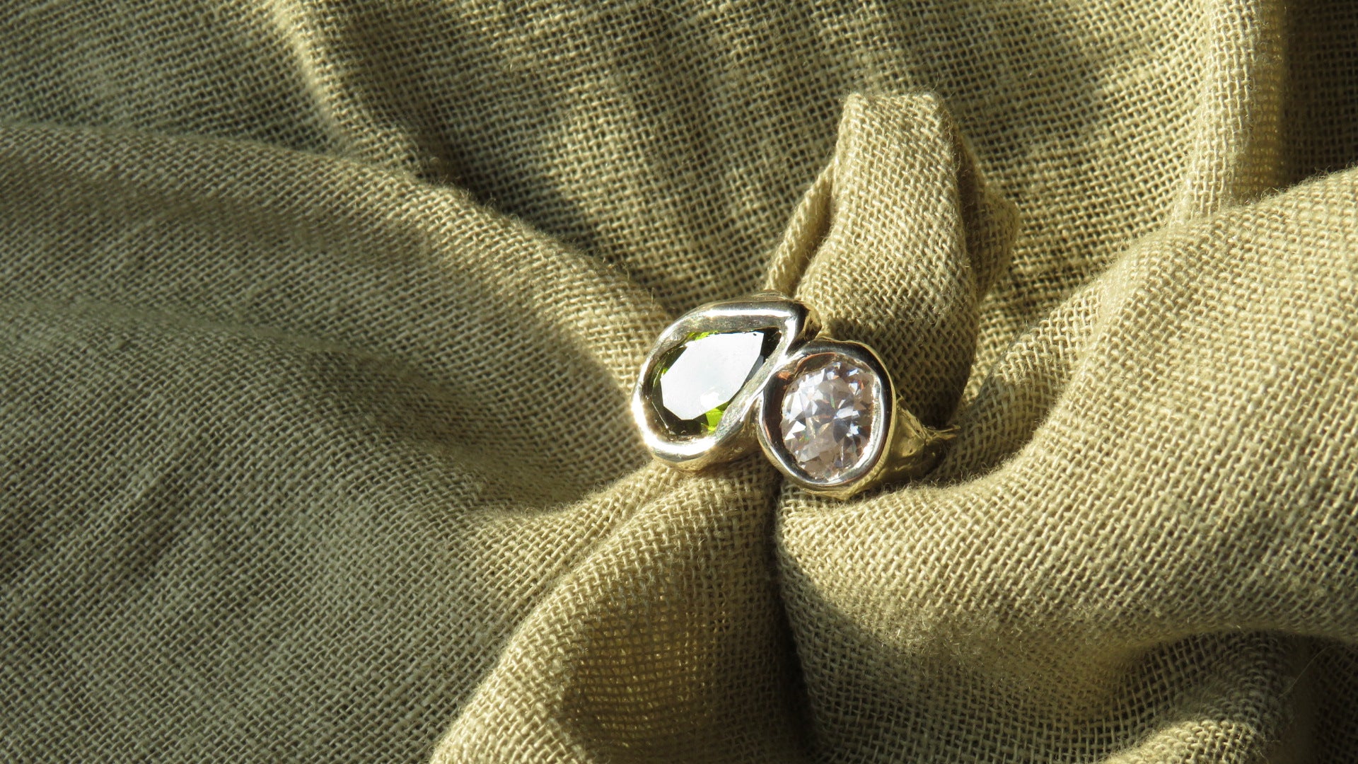 Introducing this beautiful hand crafted molten ring. This ring has been created using the lost wax casting method. Sculpted in wax and casted in Argentium Sterling Silver. This stunning piece holds a radiant Olive Cubic zirconia and a vibrant white cubic zirconia.